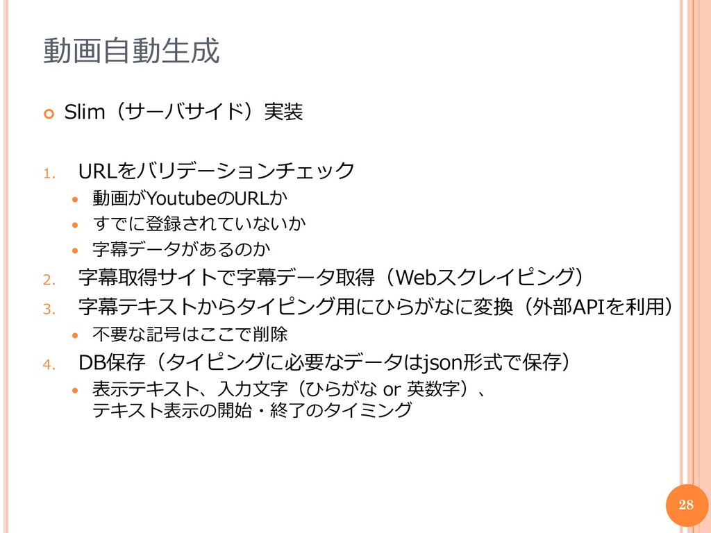 字幕データがあるのか 2. 字幕取得サイトで字幕データ取得(Webスクレイピング) 3. 字幕テキストからタイピング用にひらがなに変換(外部APIを利用) 不要な記号はここで削除 4. DB保存(タイピングに必要なデータはjson形式で保存) 表示テキスト、入力文字(ひらがな or 英数字)、 テキスト表示の開始・終了のタイミング 28