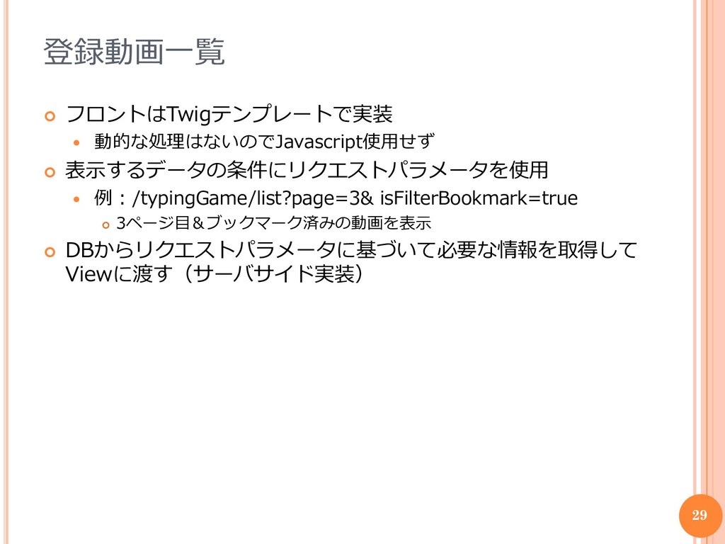 /typingGame/list?page=3& isFilterBookmark=true 3ページ目&ブックマーク済みの動画を表示 DBからリクエストパラメータに基づいて必要な情報を取得して Viewに渡す(サーバサイド実装) 29