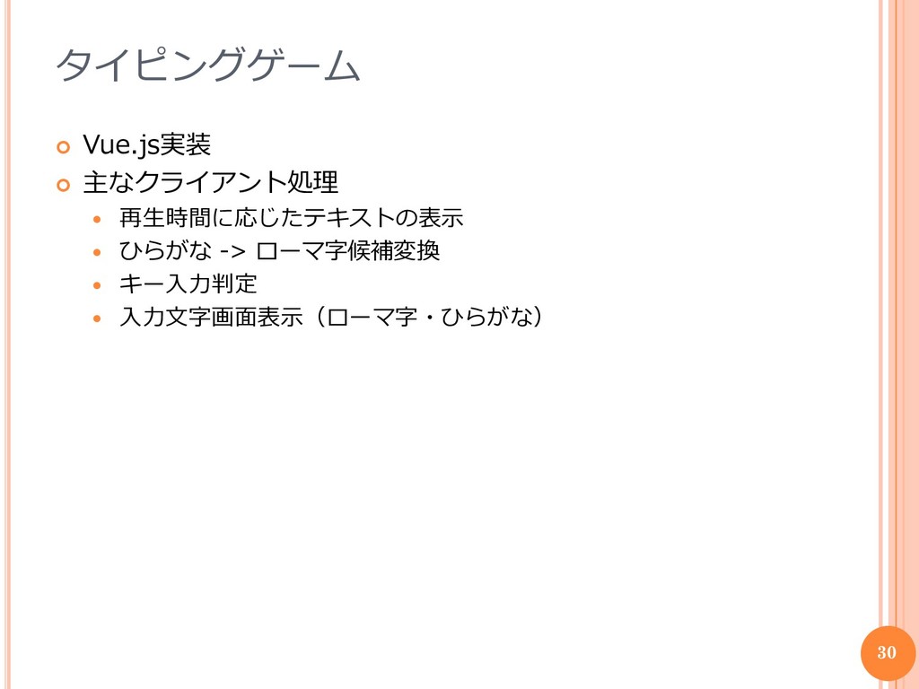 タイピングゲーム Vue.js実装 主なクライアント処理 再生時間に応じたテキストの表示 ひらがな ->