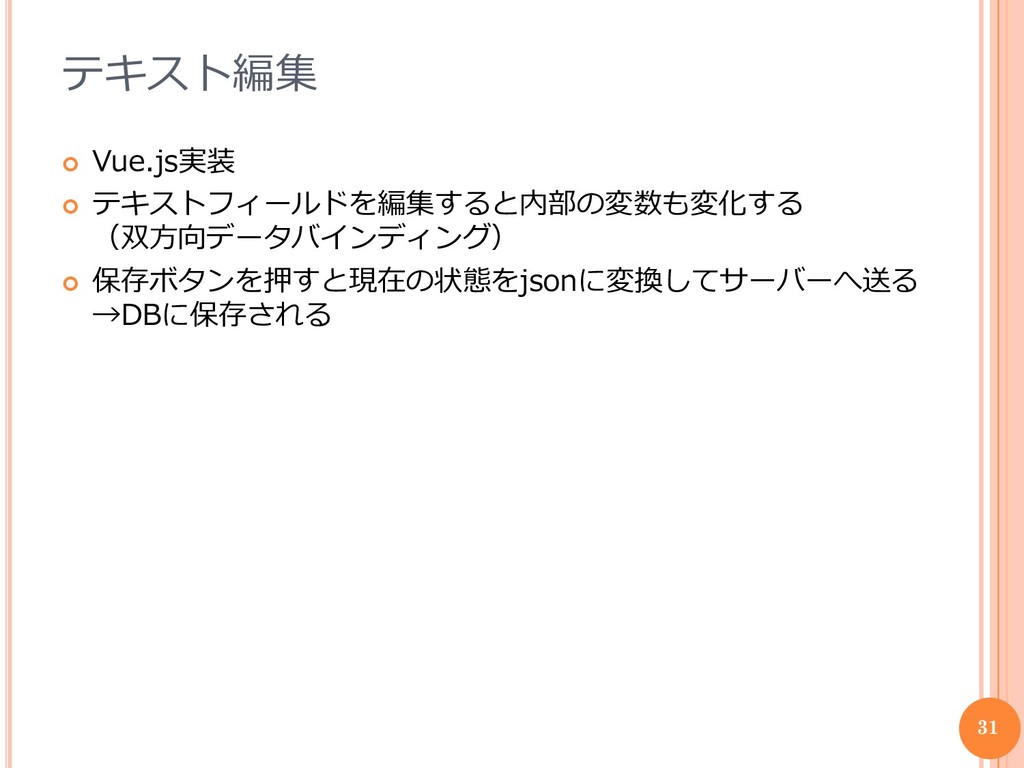 テキスト編集 Vue.js実装 テキストフィールドを編集すると内部の変数も変化する (双方向データバインディング) 保存ボタンを押すと現在の状態をjsonに変換してサーバーへ送る →DBに保存される 31