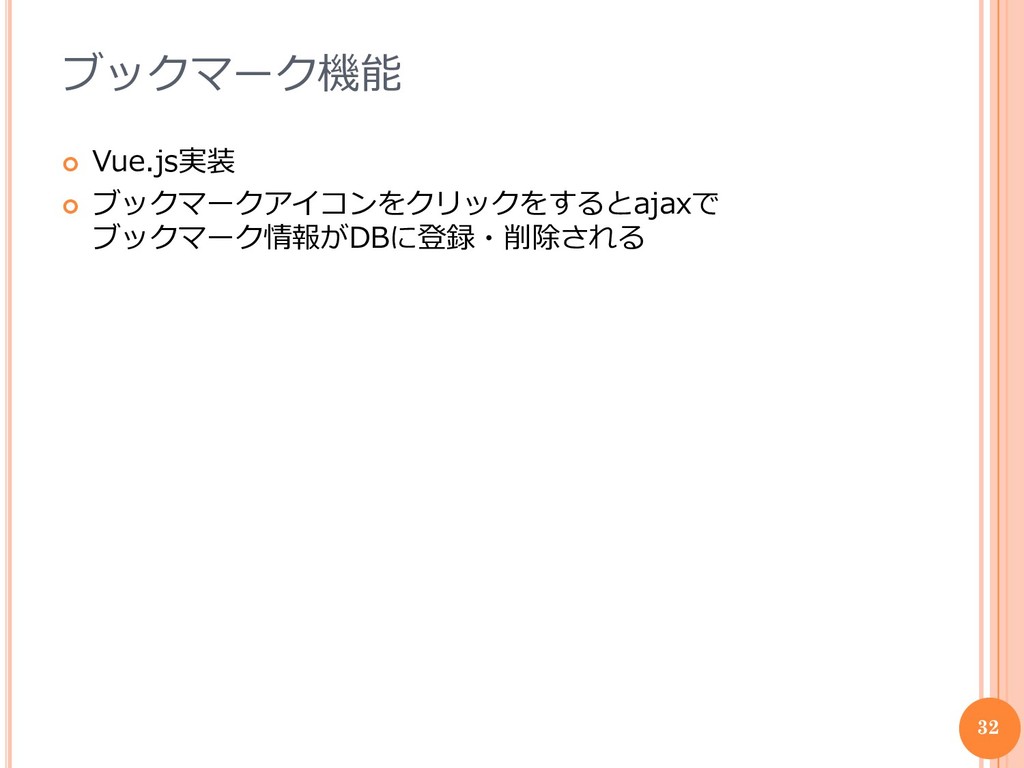ブックマーク機能 Vue.js実装 ブックマークアイコンをクリックをするとajaxで ブックマーク情報がDBに登録・削除される 32
