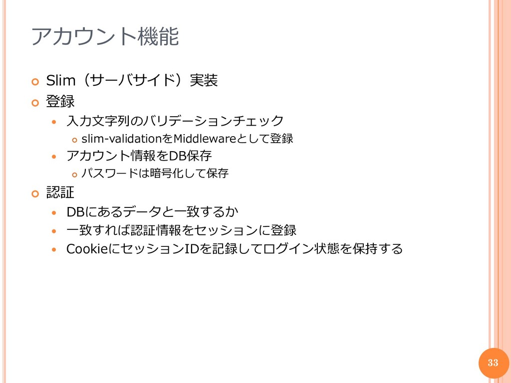 アカウント情報をDB保存 パスワードは暗号化して保存 認証 DBにあるデータと一致するか 一致すれば認証情報をセッションに登録 CookieにセッションIDを記録してログイン状態を保持する 33