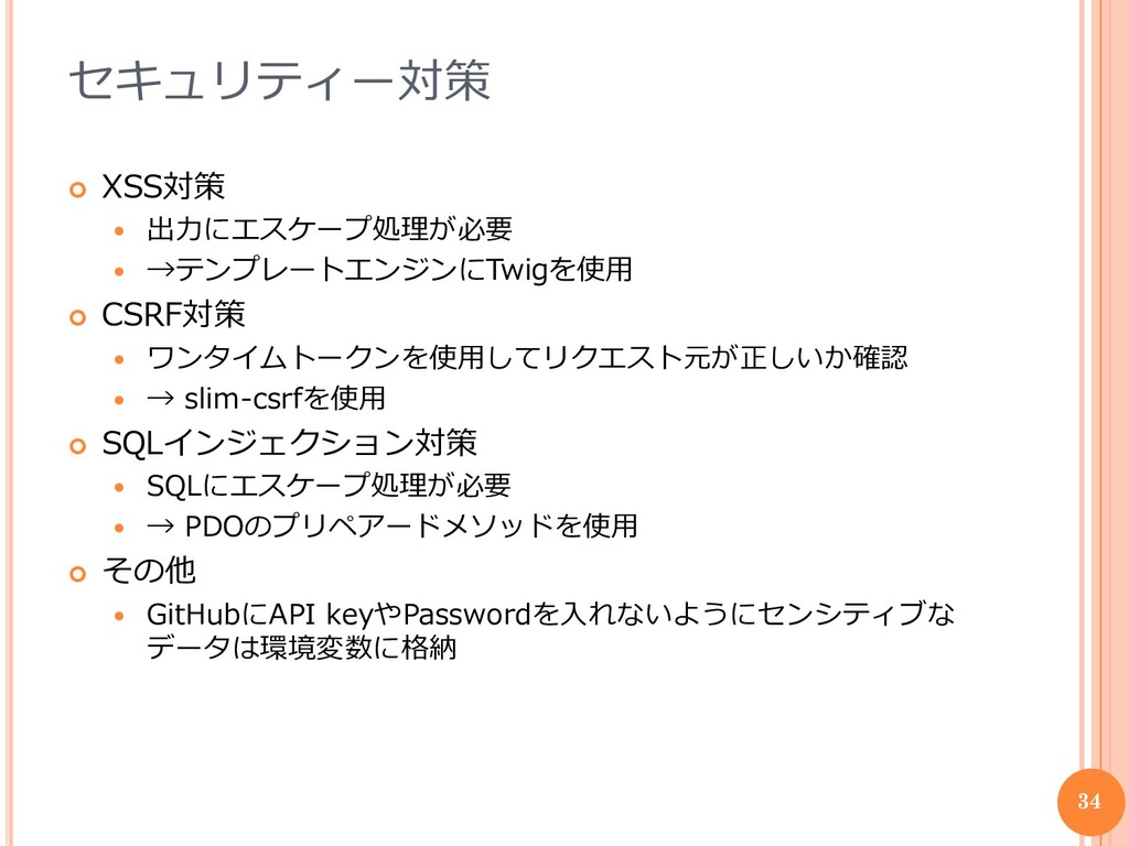 ワンタイムトークンを使用してリクエスト元が正しいか確認 → slim-csrfを使用 SQLインジェクション対策 SQLにエスケープ処理が必要 → PDOのプリペアードメソッドを使用 その他 GitHubにAPI keyやPasswordを入れないようにセンシティブな データは環境変数に格納 34