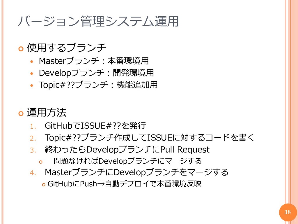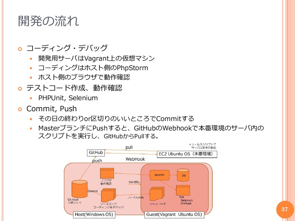 テストコード作成、動作確認 PHPUnit, Selenium Commit, Push その日の終わりor区切りのいいところでCommitする MasterブランチにPushすると、GitHubのWebhookで本番環境のサーバ内の スクリプトを実行し、GitHubからPullする。 37