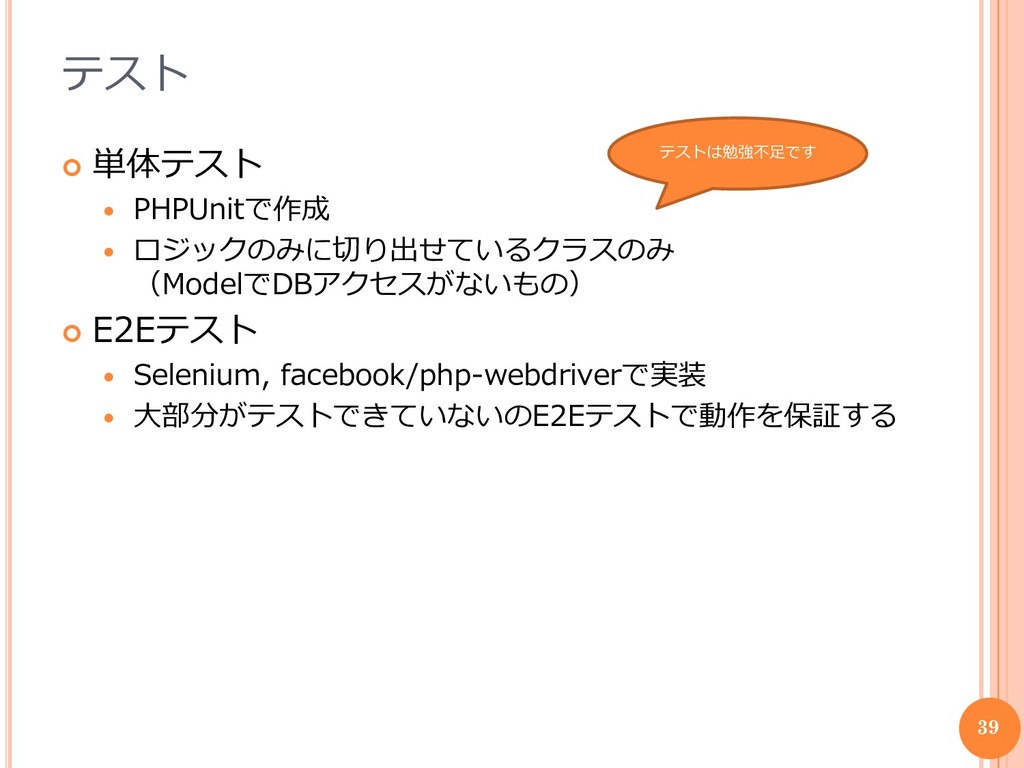 Selenium, facebook/php-webdriverで実装 大部分がテストできていないのE2Eテストで動作を保証する 39 テストは勉強不足です