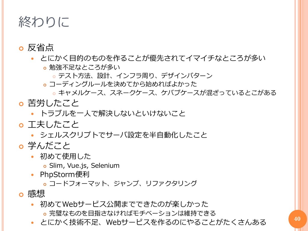 コーディングルールを決めてから始めればよかった キャメルケース、スネークケース、ケバブケースが混ざっているとこがある 苦労したこと トラブルを一人で解決しないといけないこと 工夫したこと シェルスクリプトでサーバ設定を半自動化したこと 学んだこと 初めて使用した Slim, Vue.js, Selenium PhpStorm便利 コードフォーマット、ジャンプ、リファクタリング 感想 初めてWebサービス公開までできたのが楽しかった 完璧なものを目指さなければモチベーションは維持できる とにかく技術不足、Webサービスを作るのにやることがたくさんある 40