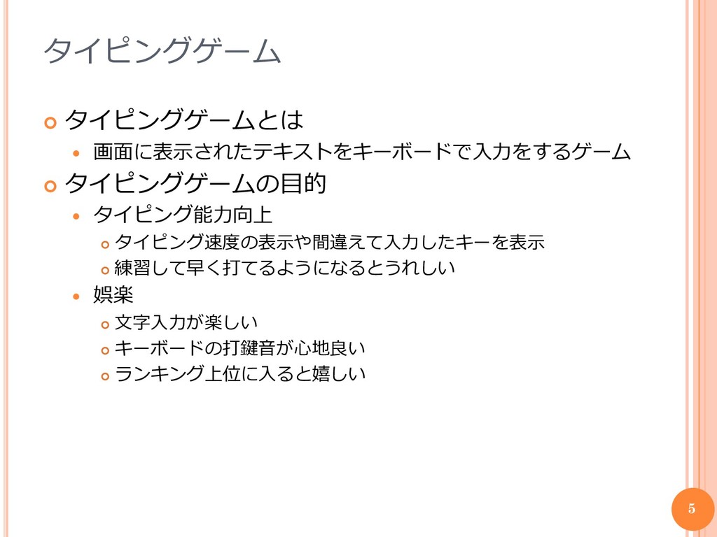 タイピングゲーム タイピングゲームとは 画面に表示されたテキストをキーボードで入力をするゲーム タイピングゲームの目的 タイピング能力向上