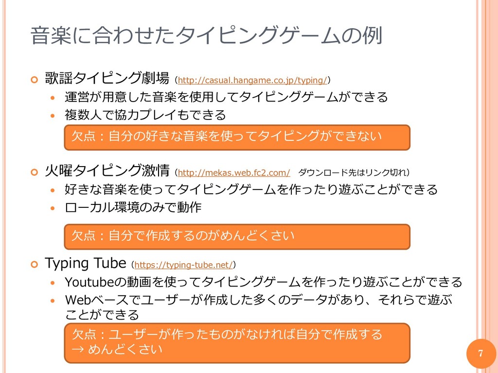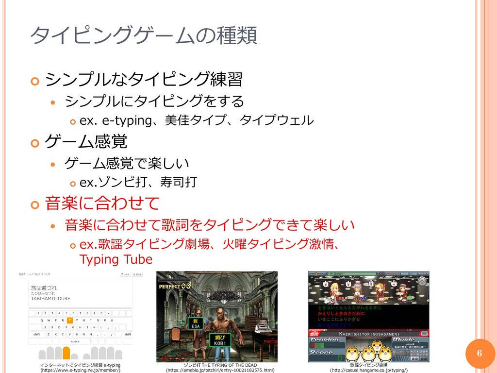音楽に合わせたタイピングゲームの例 歌謡タイピング劇場(http://casual.hangame.co.jp/typing/) 運営が用意した音楽を使用してタイピングゲームができる 複数人で協力プレイもできる 火曜タイピング激情(http://mekas.web.fc2.com/ ダウンロード先はリンク切れ)