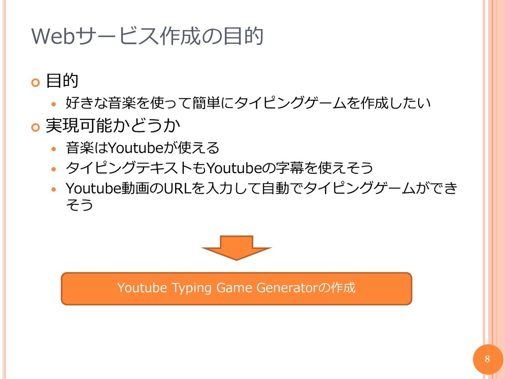 Webサービス作成の目的 目的 好きな音楽を使って簡単にタイピングゲームを作成したい 実現可能かどうか 音楽はYoutubeが使える