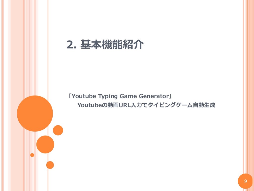 2. 基本機能紹介 「Youtube Typing Game Generator」 Youtubeの動画URL入力でタイピングゲーム自動生成 9