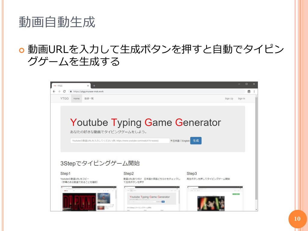 動画自動生成 動画URLを入力して生成ボタンを押すと自動でタイピン グゲームを生成する 10