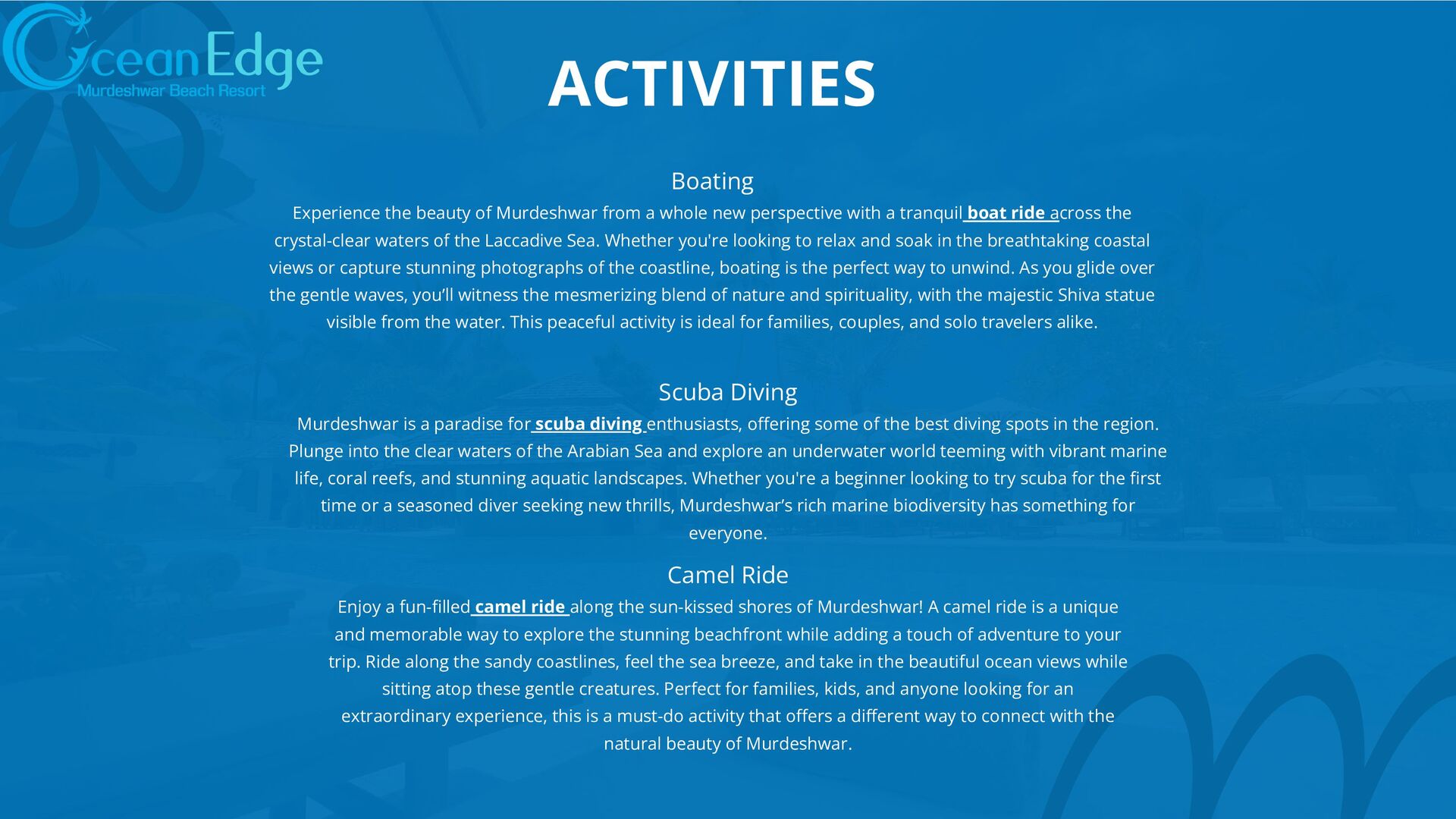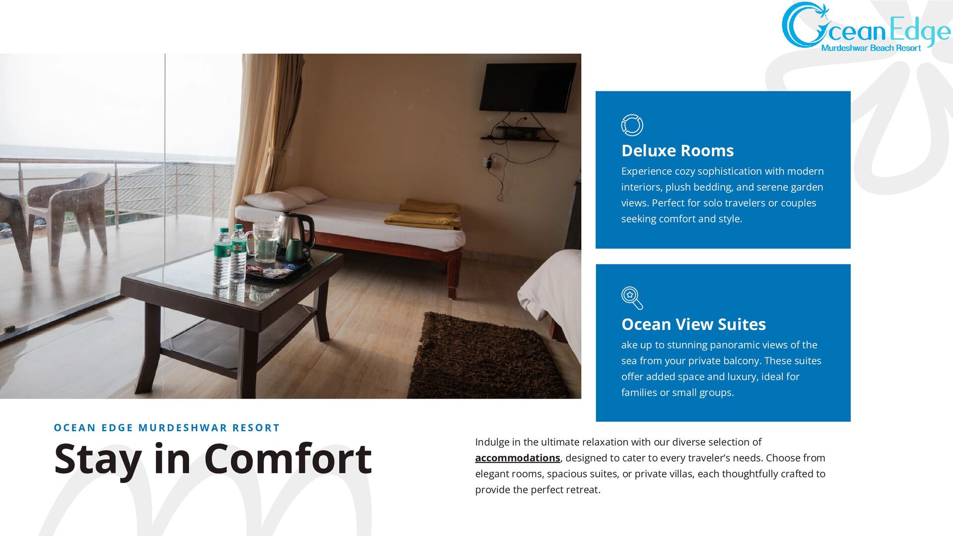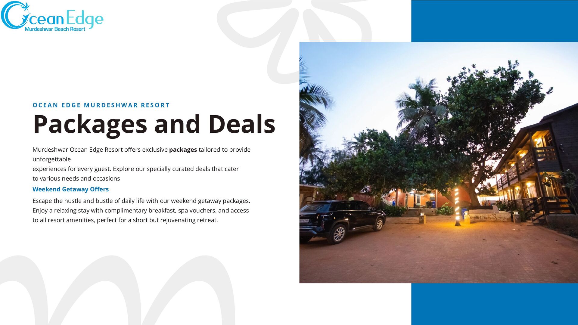 Ocean Edge Beach Resort, located in Murudeshwar, offers a perfect blend of comfort and nature. Nestled by the pristine coastline, this resort provides breathtaking views of the Arabian Sea. It is ideal for a peaceful retreat and features modern amenities, spacious rooms, and a relaxing atmosphere. Guests can enjoy the tranquil beach, indulge in local cuisine, and experience warm hospitality. Whether you're here for a family vacation or a romantic getaway, Ocean Edge Beach Resort offers an unforgettable experience in one of the most serene destinations in Murudeshwar.