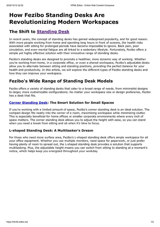 to Standing Desk In recent years, the concept of standing desks has gained widespread popularity, and for good reason. With more people working from home and spending long hours in front of screens, the health risks associated with sitting for prolonged periods have become impossible to ignore. Back pain, poor circulation, and even mental fatigue are all linked to a sedentary lifestyle. Fortunately, Fezibo offers a simple yet highly effective solution with their innovative range of standing desks. Fezibo's standing desks are designed to promote a healthier, more dynamic way of working. Whether you're working from home, in a corporate office, or even a shared workspace, Fezibo’s adjustable desks allow you to alternate between sitting and standing positions, providing the perfect balance for your health and productivity. In this article, we will explore the different types of Fezibo standing desks and how they can improve your workspace. Fezibo's Wide Range of Standing Desk Models Fezibo offers a variety of standing desks that cater to a broad range of needs, from minimalist designs to larger, more customizable configurations. No matter your workspace size or design preference, Fezibo has a desk that fits. Corner Standing Desk: The Smart Solution for Small Spaces If you're working with a limited amount of space, Fezibo's corner standing desk is an ideal solution. The compact design fits neatly into the corner of a room, maximizing workspace while minimizing clutter. This is especially beneficial for home offices or smaller corporate environments where every inch of space matters. The corner standing desk allows you to adjust the height with ease, so you can stand when you need a break from sitting and sit when it's time to focus. L-shaped Standing Desk: A Multitasker's Dream For those who need more surface area, Fezibo’s L-shaped standing desk offers ample workspace for all your office equipment. Whether you use multiple monitors, need space for paperwork, or just prefer having plenty of room to spread out, the L-shaped standing desk provides a solution that supports multitasking. Plus, the adjustable height means you can switch from sitting to standing at a moment’s notice, which helps keep you energized throughout your workday. 2024/12/12 22:52 HTML Editor - Online Web Content Composer https://html5-editor.net 1/5