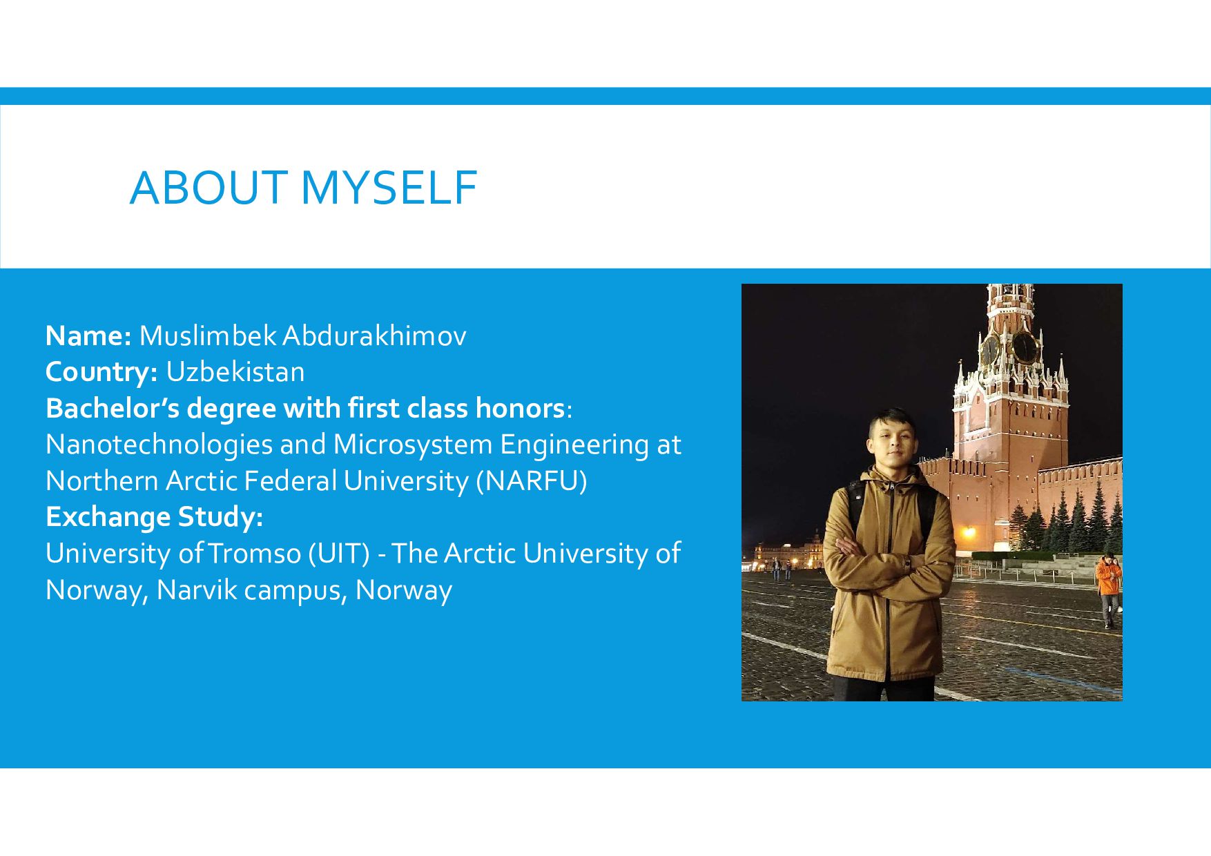 of NARFU” with the special recommendation letter of my university’s rector – 2023 Diploma I Federal Universities Olympiad in Applied Informatics - 2023 Diploma II Best International Student of the year in Arkhangelsk region – 2022 The Holder of the Highest Academic Scholarship of NARFU – 2021,2022,2023