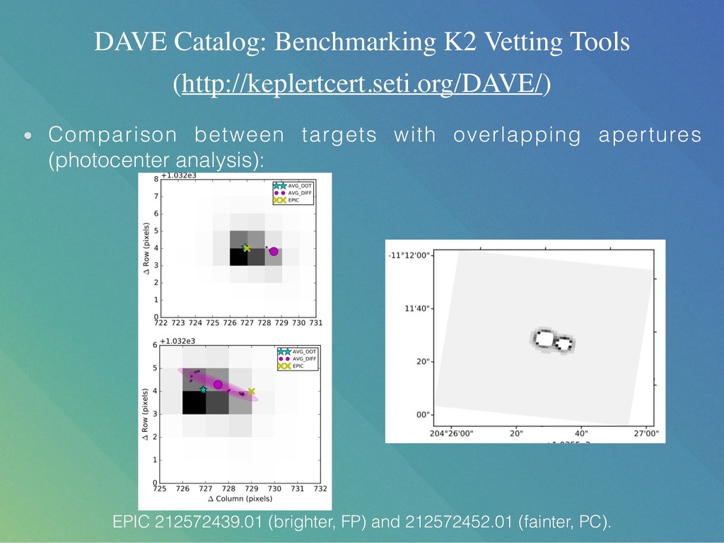 unique. (6-hr roll, single campaign) Blindly using Kepler trained metrics is dangerous. We find that there is no one-size-fits-all recipe to choose one detrending over another. Consider them all. Future Work K2 Campaigns 11-20 remain Multi-campaign search/vetting will create new challenges. Improve Automation and Usability of Code Generate a full consistent catalogs http://keplertcert.seti.org/DAVE/