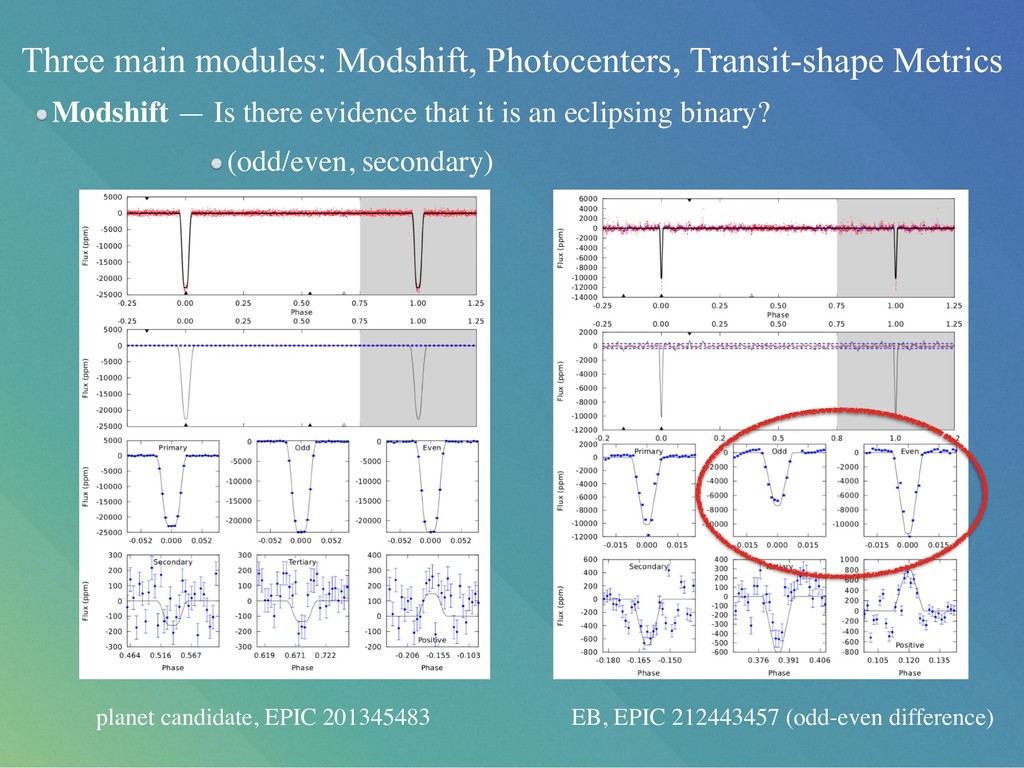 transit? Quasi-sinusoidal modulations masquerading as a transit signal (EPIC 212454160.01) Three main modules: Modshift, Photocenters, Transit-shape Metrics • LPP Transit Metric — Compares signal to Kepler transits • SWEET — Fits sine-wave to signal to see if it is a simpler model.