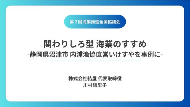 第2回海業推進全国協議会 関わりしろ型 海業のすすめ -静岡県沼津市 内浦漁協直営いけすやを事例に- 株式会社結屋 代表取締役 川村結里子