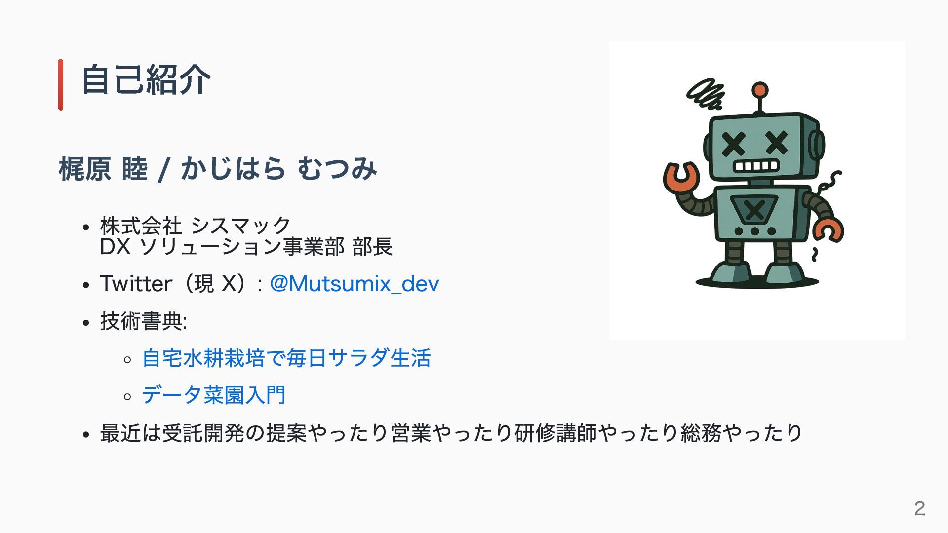 Twitter(現 X): @Mutsumix_dev 技術書典: 自宅水耕栽培で毎日サラダ生活 データ菜園入門 最近は受託開発の提案やったり営業やったり研修講師やったり総務やったり 自己紹介 2