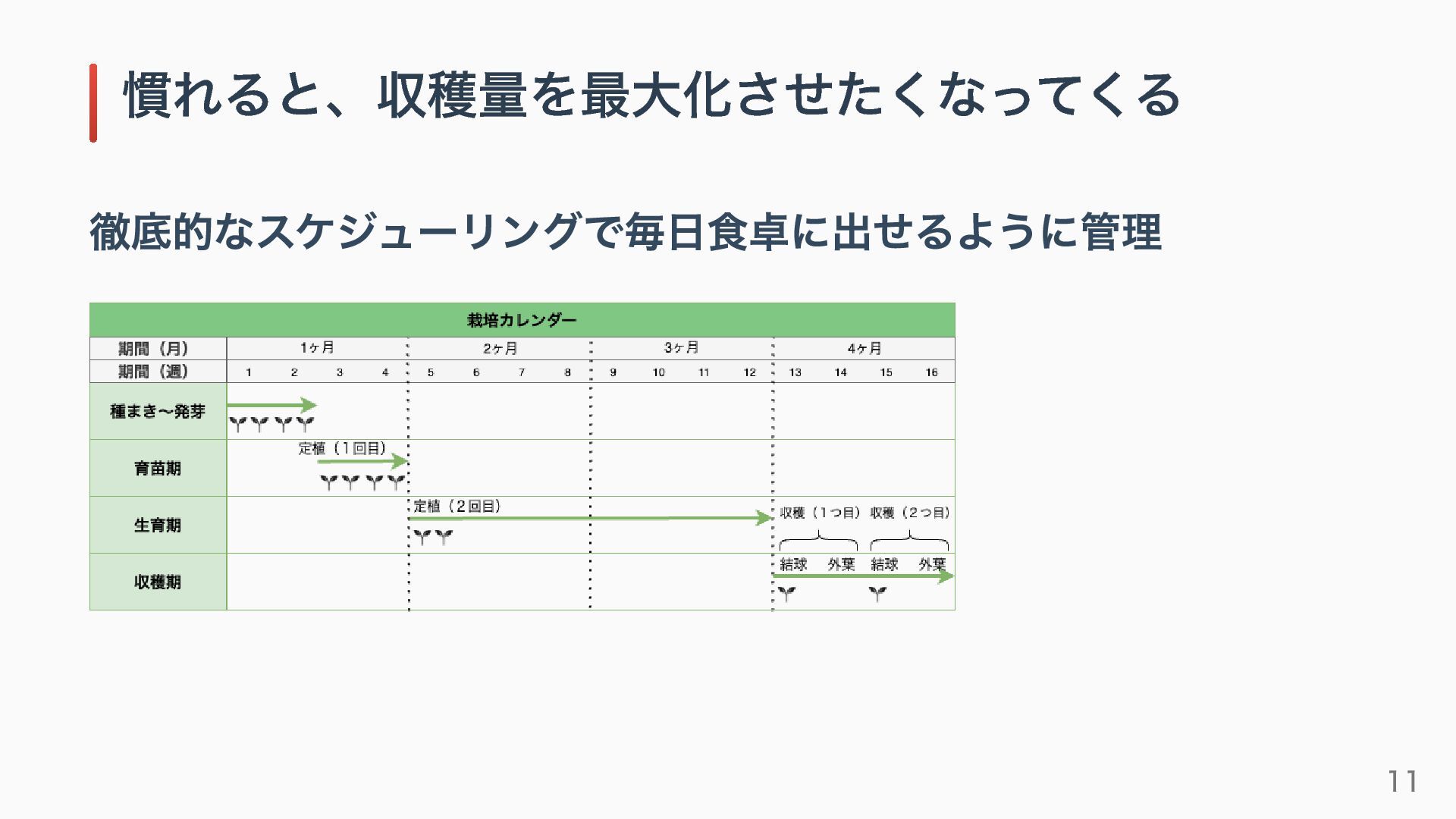 徹底的なスケジューリングで毎日食卓に出せるように管理 慣れると、収穫量を最大化させたくなってくる 11