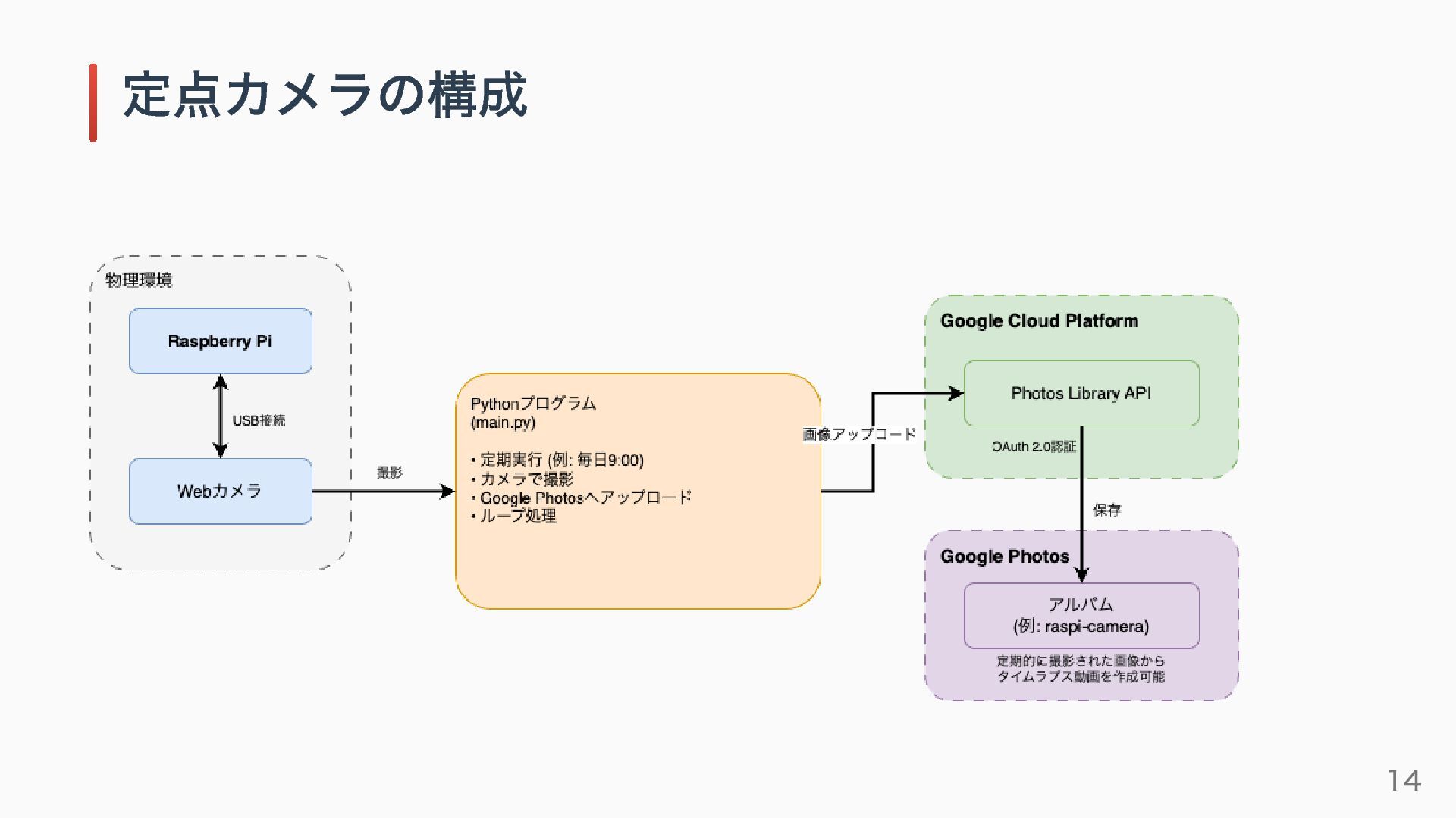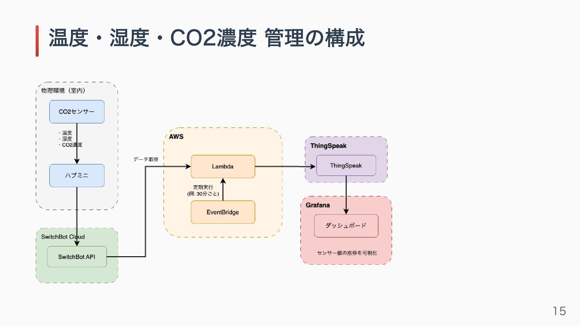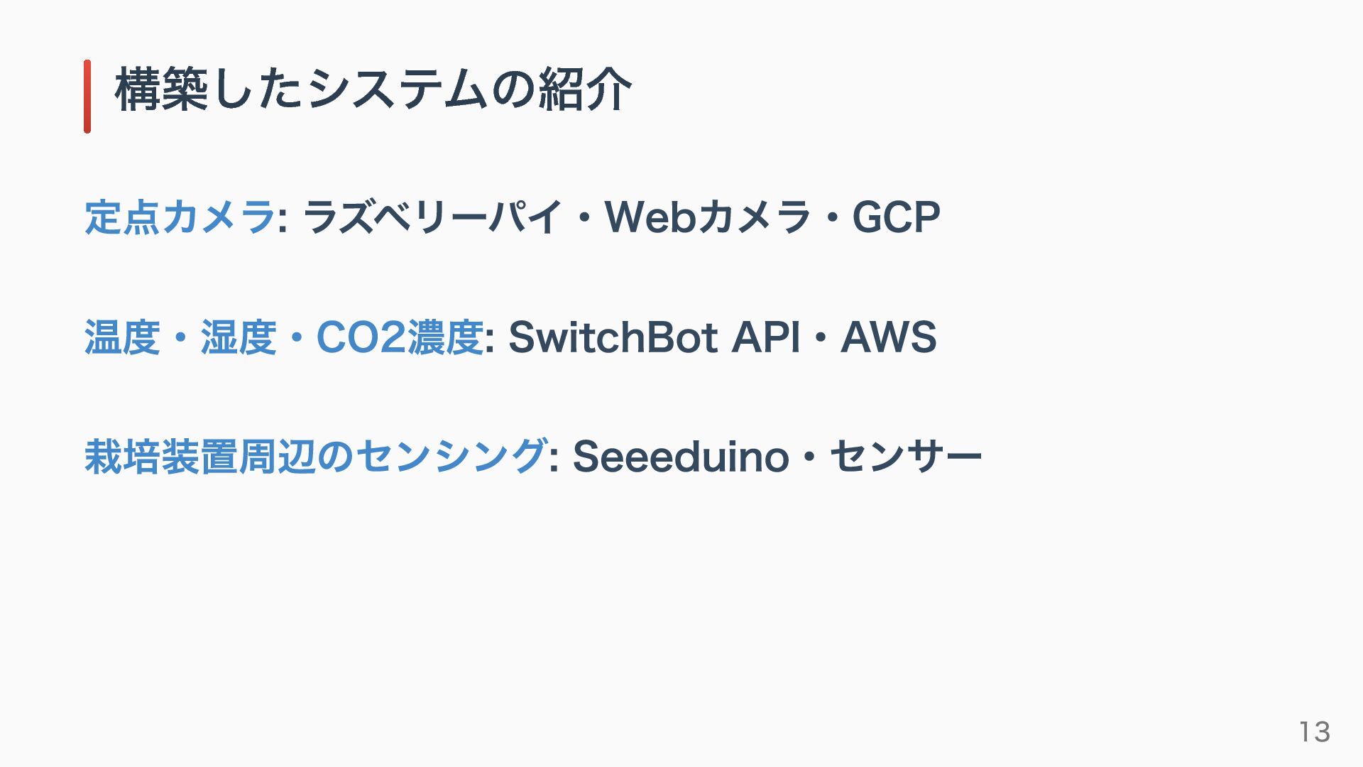 定点カメラ: ラズベリーパイ・Webカメラ・GCP 温度・湿度・CO2濃度: SwitchBot API・AWS 栽培装置周辺のセンシング: Seeeduino・センサー 構築したシステムの紹介 13
