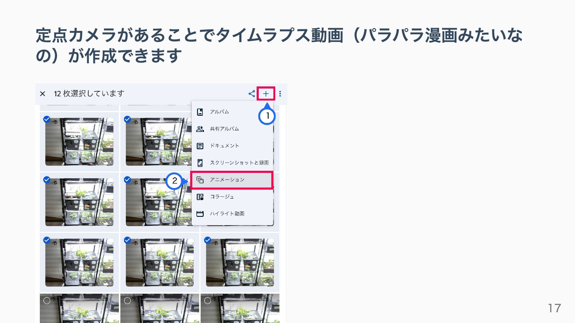 定点カメラがあることでタイムラプス動画(パラパラ漫画みたいな の)が作成できます 17