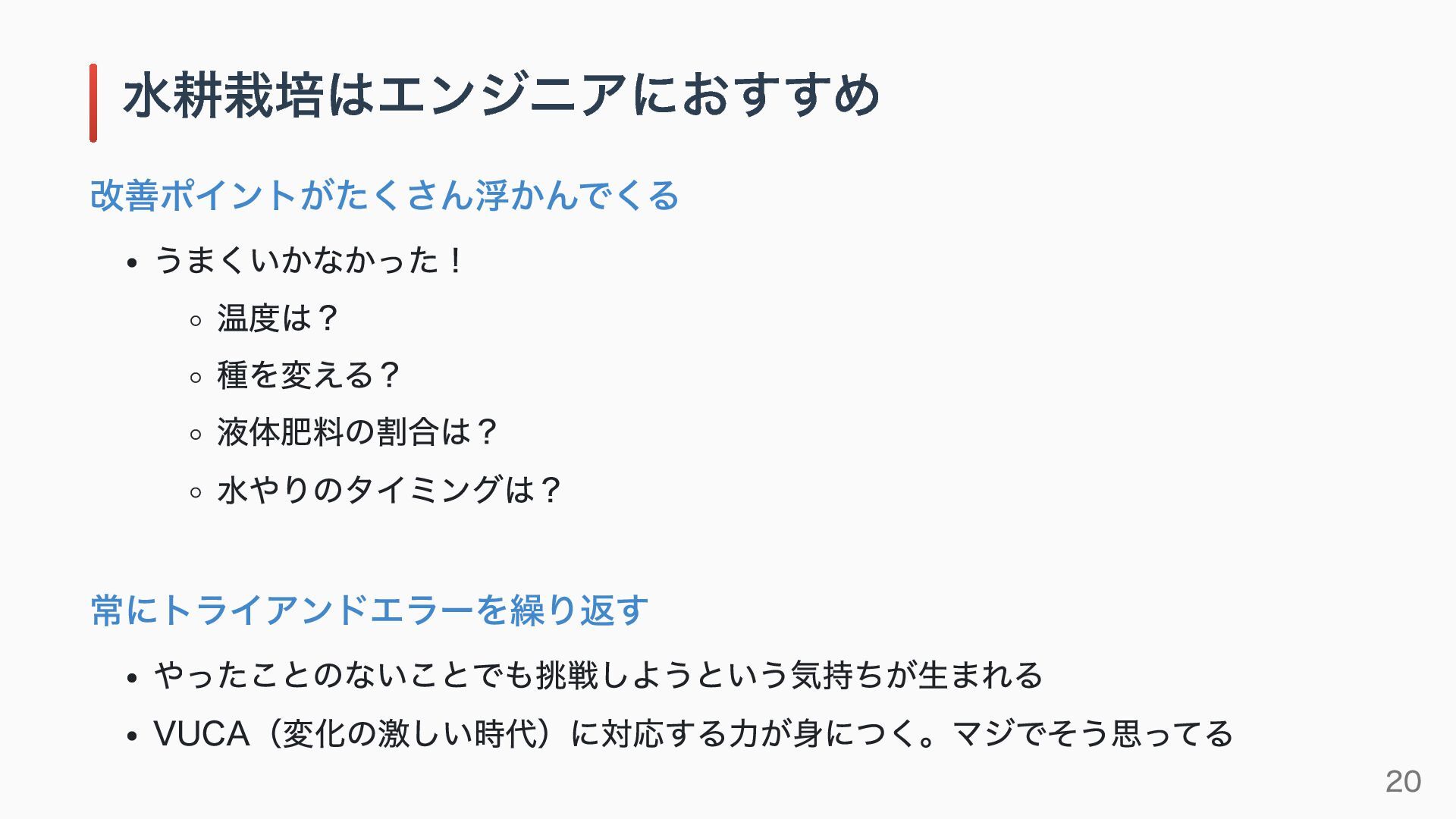 改善ポイントがたくさん浮かんでくる うまくいかなかった! 温度は? 種を変える? 液体肥料の割合は? 水やりのタイミングは? 常にトライアンドエラーを繰り返す やったことのないことでも挑戦しようという気持ちが生まれる VUCA(変化の激しい時代)に対応する力が身につく。マジでそう思ってる 水耕栽培はエンジニアにおすすめ