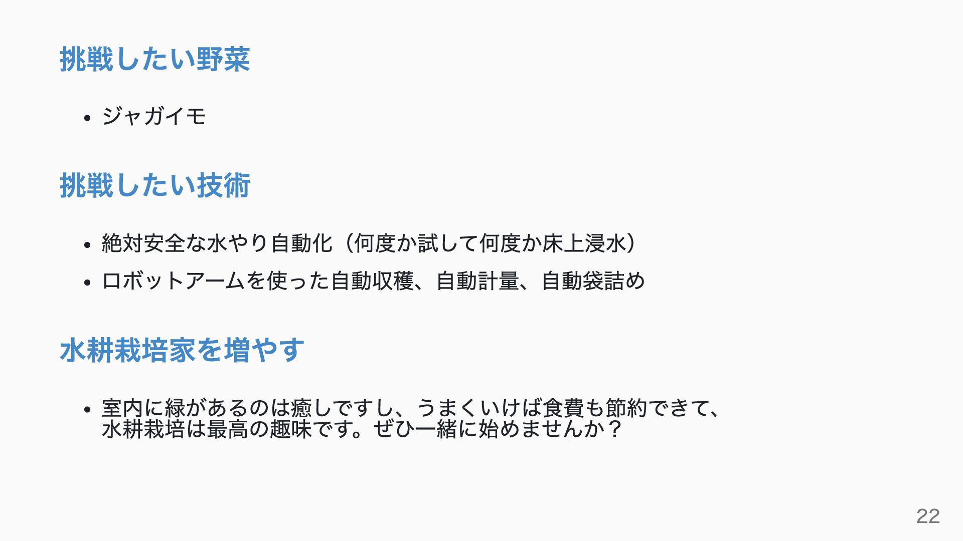 挑戦したい野菜 ジャガイモ 挑戦したい技術 絶対安全な水やり自動化(何度か試して何度か床上浸水) ロボットアームを使った自動収穫、自動計量、自動袋詰め 水耕栽培家を増やす 室内に緑があるのは癒しですし、うまくいけば食費も節約できて、 水耕栽培は最高の趣味です。ぜひ一緒に始めませんか? 22