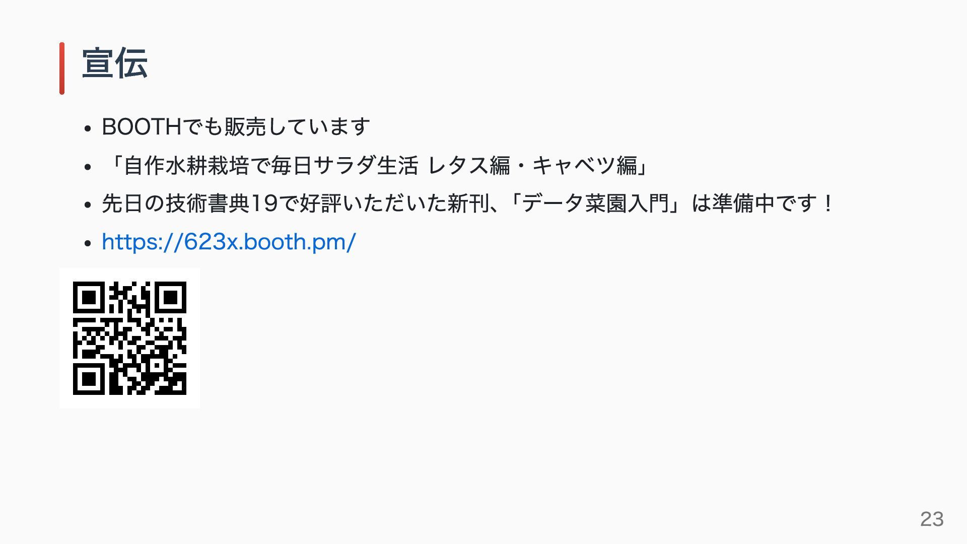 BOOTHでも販売しています 「自作水耕栽培で毎日サラダ生活 レタス編・キャベツ編」 先日の技術書典19で好評いただいた新刊、 「データ菜園入門」は準備中です! https://623x.booth.pm/ 宣伝 23