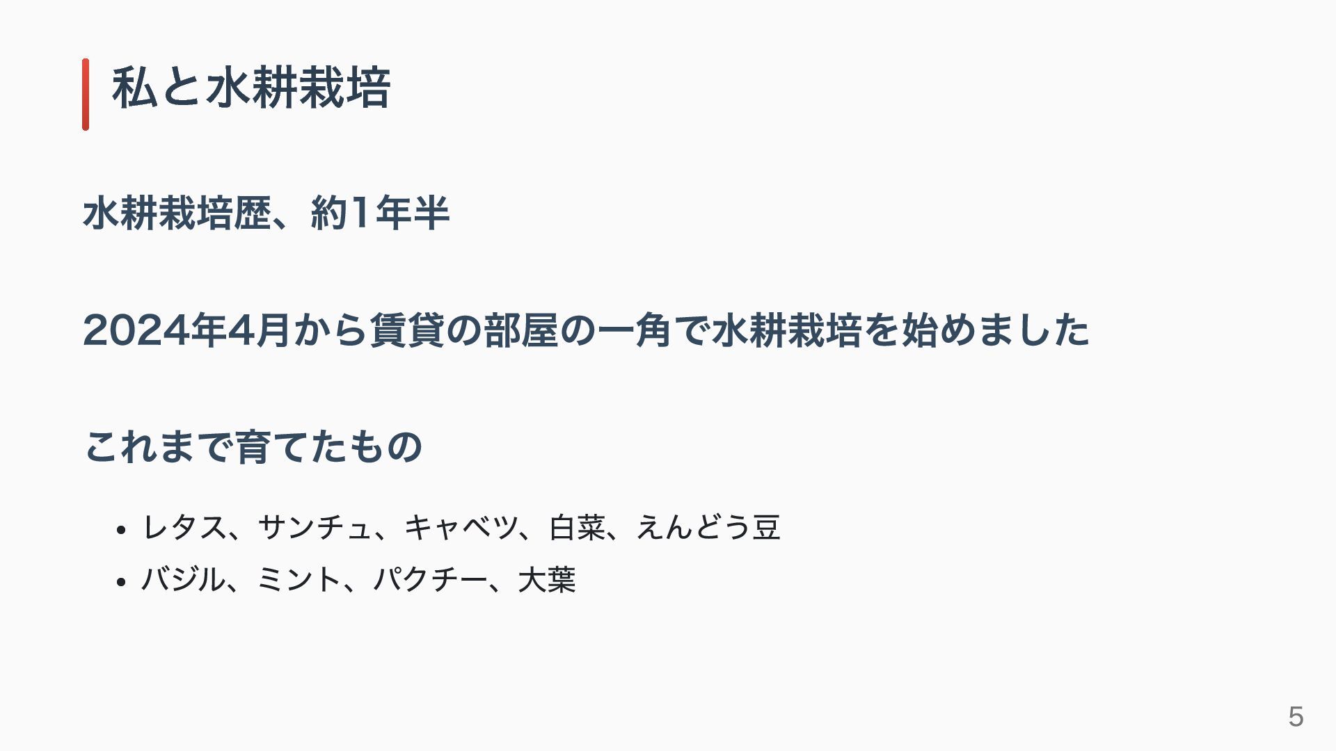 水耕栽培歴、約1年半 2024年4月から賃貸の部屋の一角で水耕栽培を始めました これまで育てたもの レタス、サンチュ、キャベツ、白菜、えんどう豆 バジル、ミント、パクチー、大葉 私と水耕栽培 5