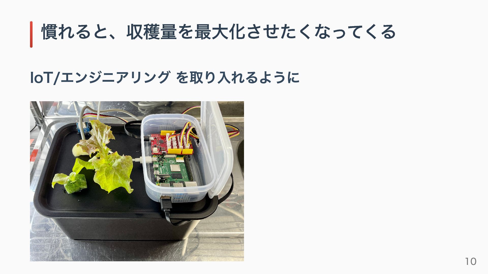 IoT/エンジニアリング を取り入れるように 慣れると、収穫量を最大化させたくなってくる 10