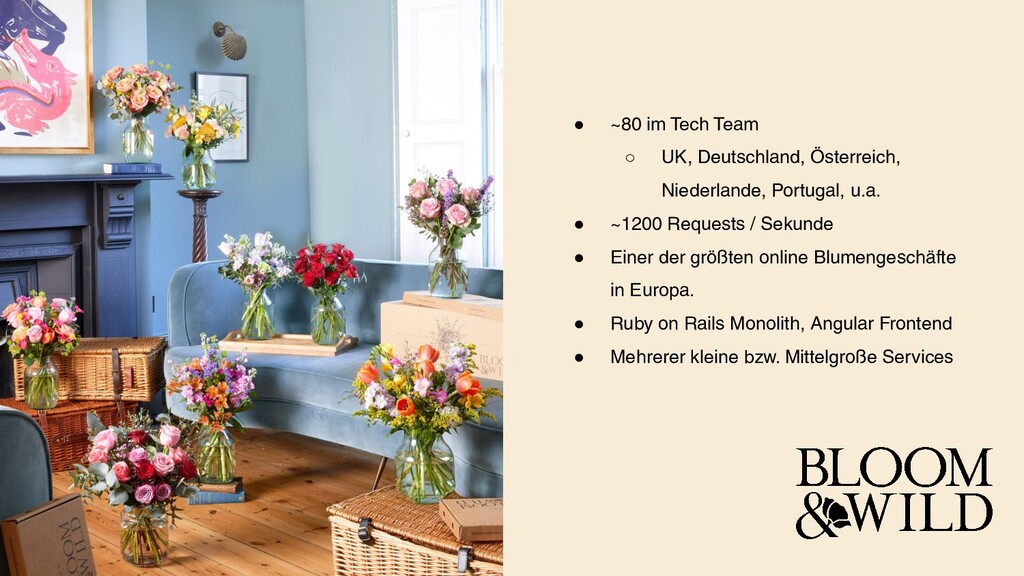 Portugal, u.a. • ~1200 Requests / Sekunde • Einer der größten online Blumengeschäfte in Europa. • Ruby on Rails Monolith, Angular Frontend • Mehrerer kleine bzw. Mittelgroße Services