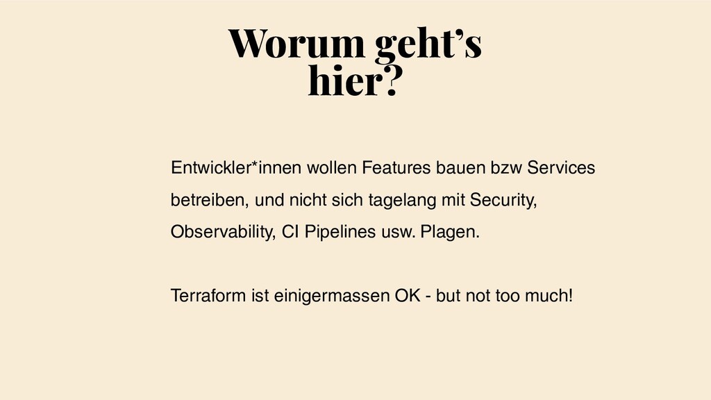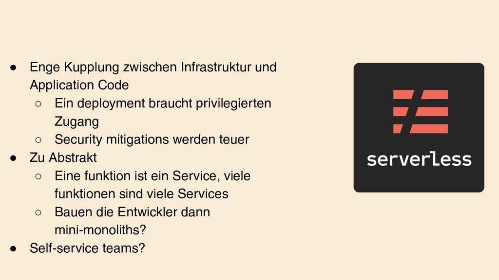 deployment braucht privilegierten Zugang ◦ Security mitigations werden teuer • Zu Abstrakt ◦ Eine funktion ist ein Service, viele funktionen sind viele Services ◦ Bauen die Entwickler dann mini-monoliths? • Self-service teams?