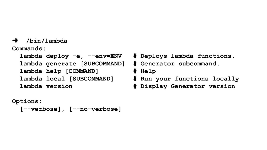 functions. lambda generate [SUBCOMMAND] # Generator subcommand. lambda help [COMMAND] # Help lambda local [SUBCOMMAND] # Run your functions locally lambda version # Display Generator version Options: [--verbose], [--no-verbose]