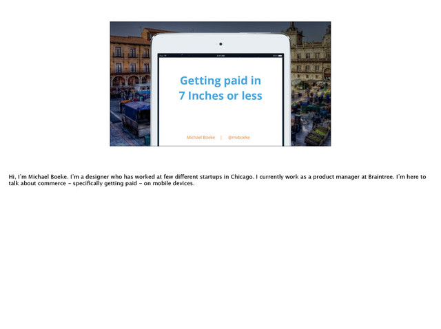 In this presentation, I explore the global shift to mobile commerce - which is happening even faster than you think. We will look at emerging hardware and software technologies behind an explosion of experimentation in how we pay for almost everything. We’ll also look at the ways designers and developers can create great experiences in the world of mobile commerce.