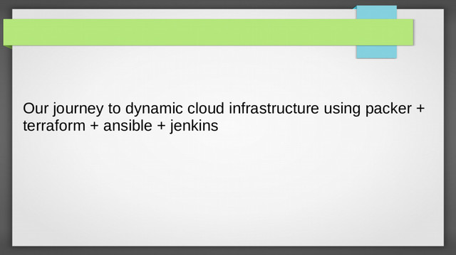 infrastructure greatly reduced the complexity. • Adding packer builds for ready to use custom images. • Tying in of packer + terraform + ansible and running it via jenkins. • Very close to dynamic infrastructure(we need to work on quick and safe backup and retrival of data)