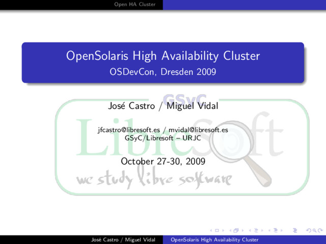 of Solaris Cluster software is now Open High Avalaibility Cluster 2009.06. The Solaris Cluster product group contains Sun Cluster software, Sun Cluster agents (data services), and Sun Cluster Geographic Edition software. Includes the core clustering framework, a suite of HA agents for various applications, an automated test framework, and a disaster recovery extension. Jos´ e Castro / Miguel Vidal OpenSolaris High Availability Cluster