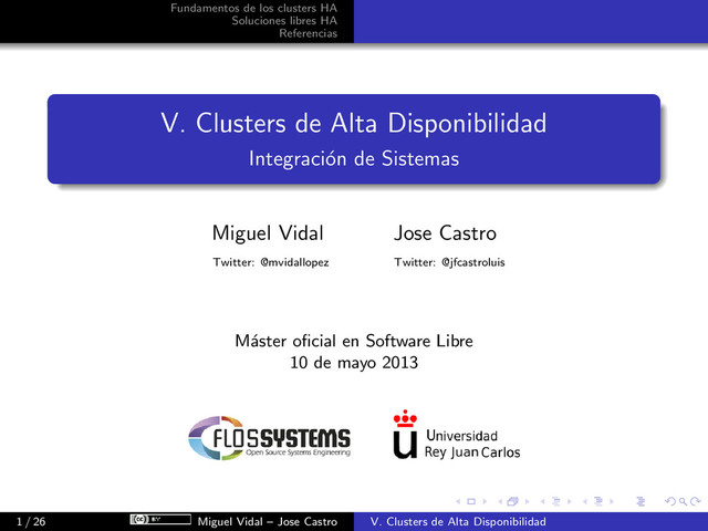 Clusters de Alta Disponibilidad Integraci´ on de Sistemas Miguel Vidal Jose Castro Twitter: @mvidallopez Twitter: @jfcastroluis M´ aster oficial en Software Libre 10 de mayo 2013 1 / 26 Miguel Vidal – Jose Castro V. Clusters de Alta Disponibilidad