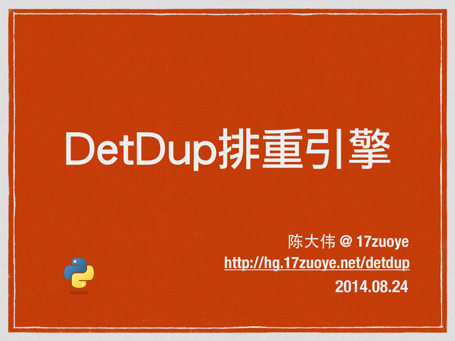 17zuoye内部 排重引擎 演讲稿分享。detdup是我在17zuoye第一个大项目,花了两三个月,最后代码加测试870行,目前应用于小学和初高中题库平台。项目源码 https://github.com/17zuoye/detdup ,欢迎交流。