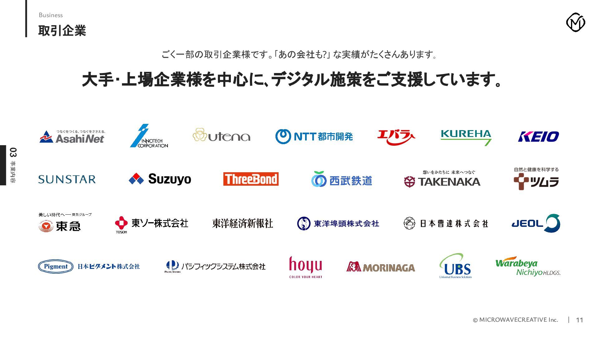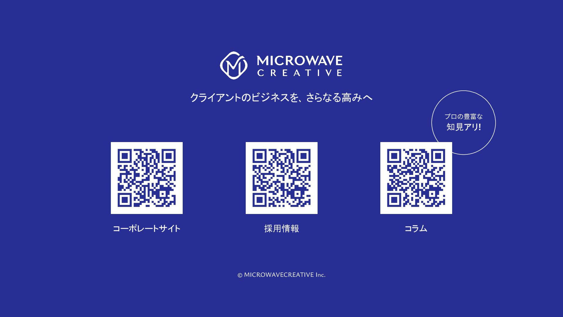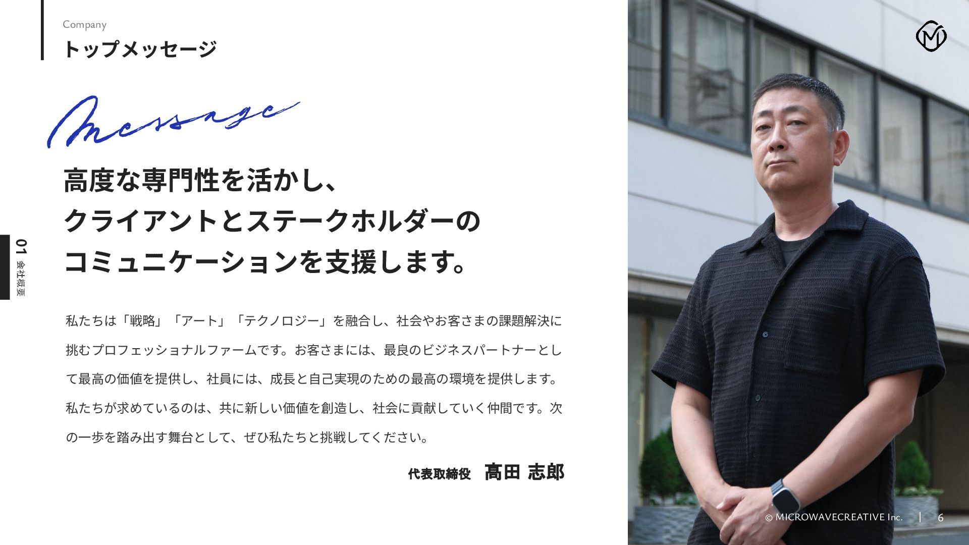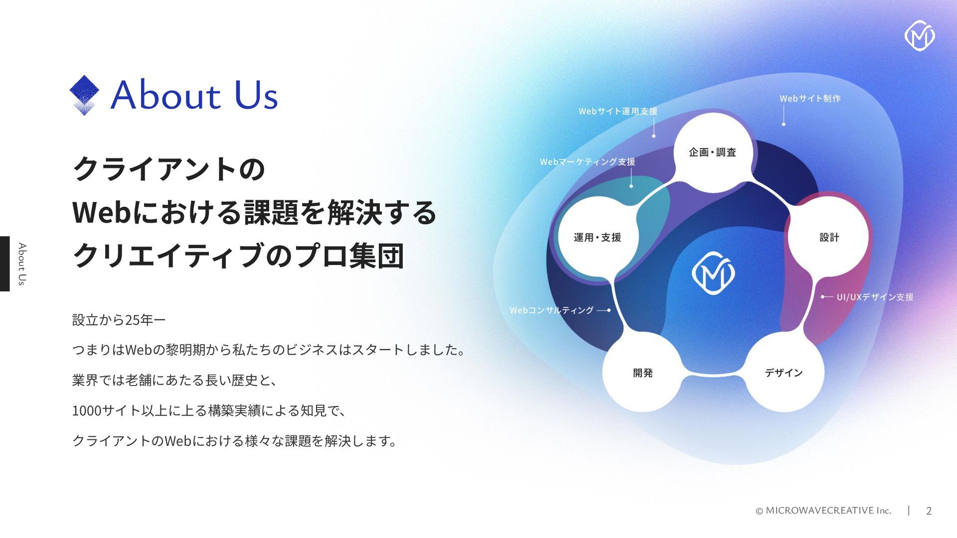 株式会社マイクロウェーブクリエイティブの採用ピッチ資料です。 私たちはWeb黎明期から25年以上にわたり、1,000サイト以上のデジタル戦略・制作を支援してきたクリエイティブ集団です。