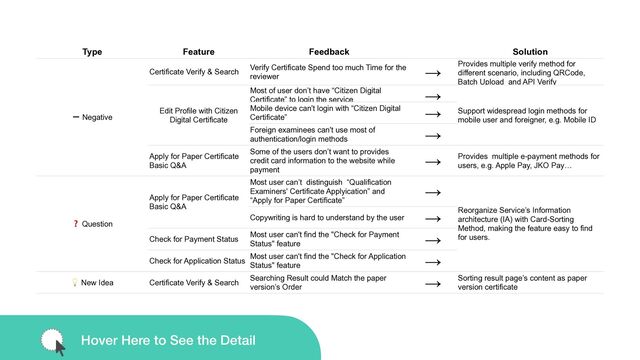 Verify Certificate Spend too much Time for the reviewer → Provides multiple verify method for different scenario, including QRCode, Batch Upload and API Verify Edit Profile with Citizen Digital Certificate Most of user don’t have “Citizen Digital Certificate” to login the service → Support widespread login methods for mobile user and foreigner, e.g. Mobile ID Mobile device can't login with “Citizen Digital Certificate” → Foreign examinees can't use most of authentication/login methods → Apply for Paper Certificate Basic Q&A Some of the users don’t want to provides credit card information to the website while payment → Provides multiple e-payment methods for users, e.g. Apple Pay, JKO Pay… ❓ Question Apply for Paper Certificate Basic Q&A Most user can’t distinguish “Qualification Examiners' Certificate Applyication” and “Apply for Paper Certificate” → Reorganize Service’s Information architecture (IA) with Card-Sorting Method, making the feature easy to find for users. Copywriting is hard to understand by the user → Check for Payment Status Most user can't find the "Check for Payment Status" feature → Check for Application Status Most user can't find the "Check for Application Status" feature → 💡 New Idea Certificate Verify & Search Searching Result could Match the paper version’s Order → Sorting result page’s content as paper version certificate Hover Here to See the Detail