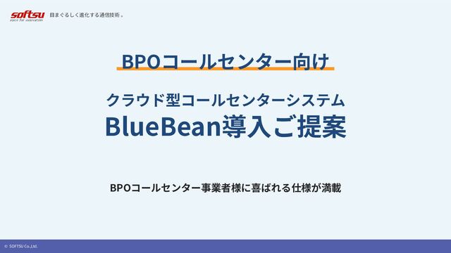 ⽬まぐるしく進化する通信技術 。 © SOFTSU Co.,Ltd. クラウド型コールセンターシステム BlueBean導⼊ご提案 BPOコールセンター事業者様に喜ばれる仕様が満載 BPOコールセンター向け