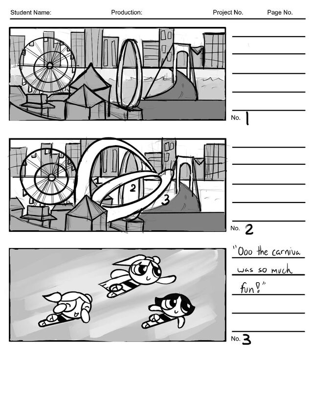A scene for a "Powerpuff Girls" storyboard using a script that includes dialogue and camera movements. I used my creative freedom to design the look-alike villains and direct the fight scene