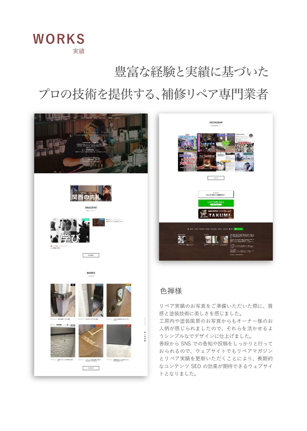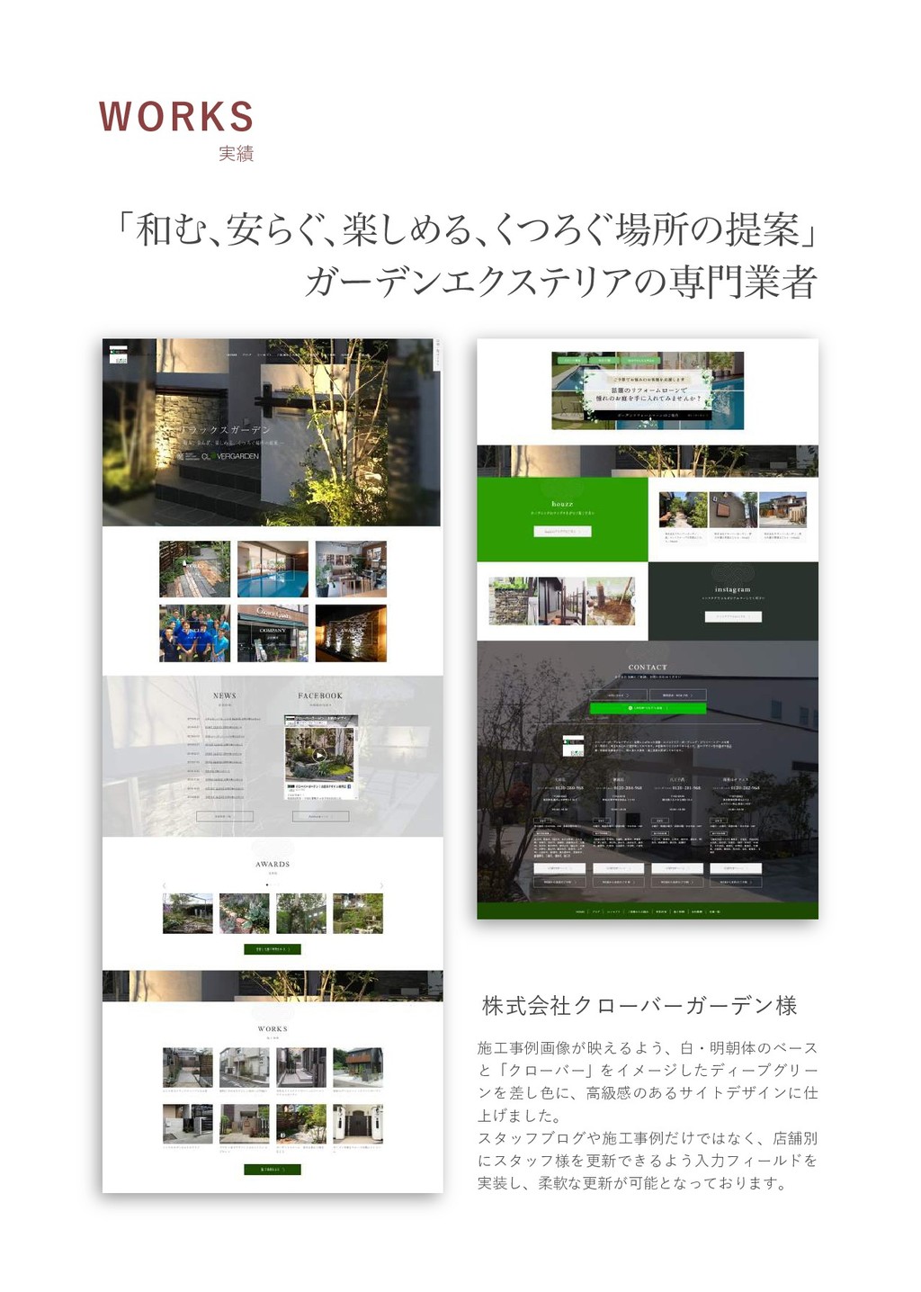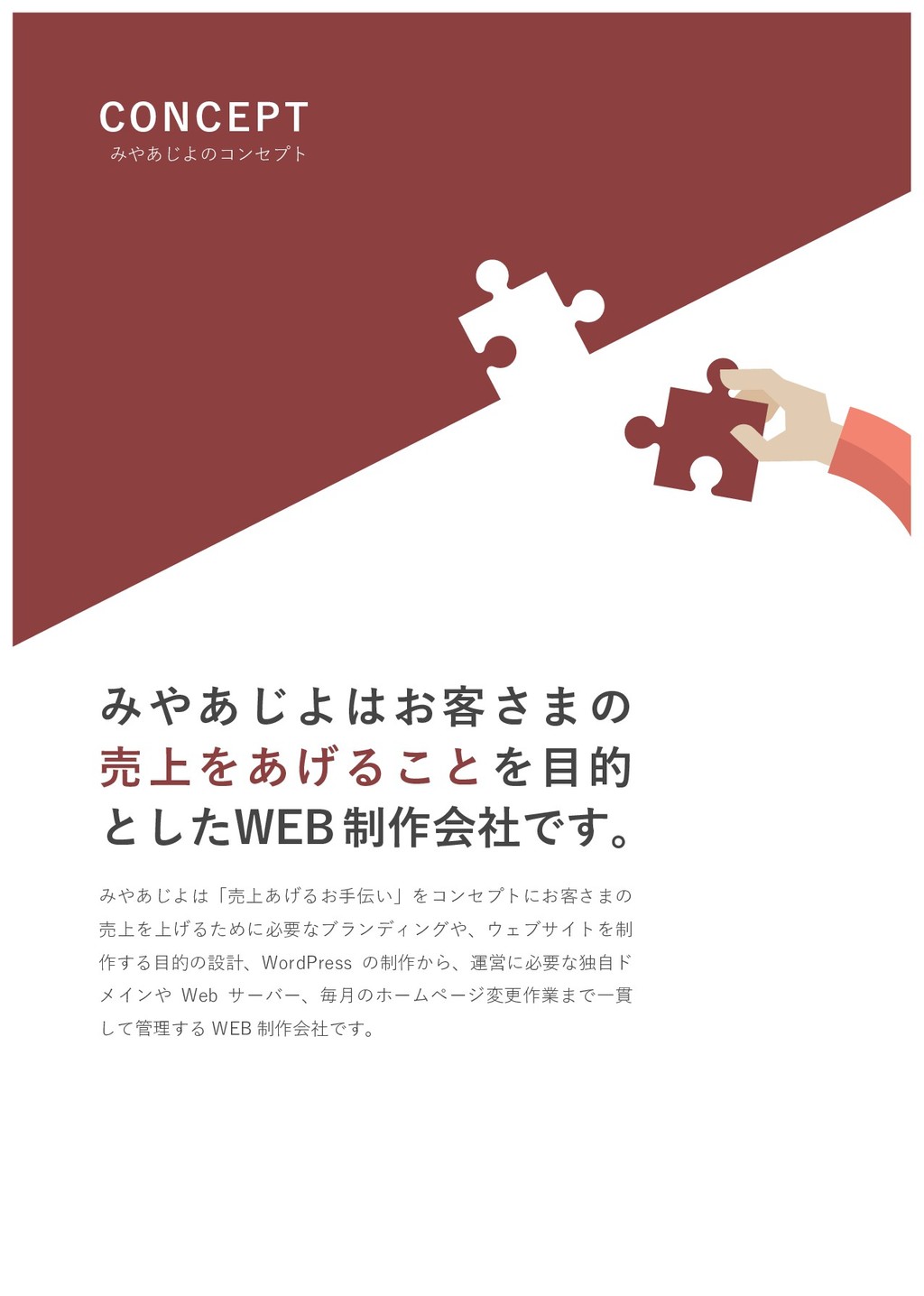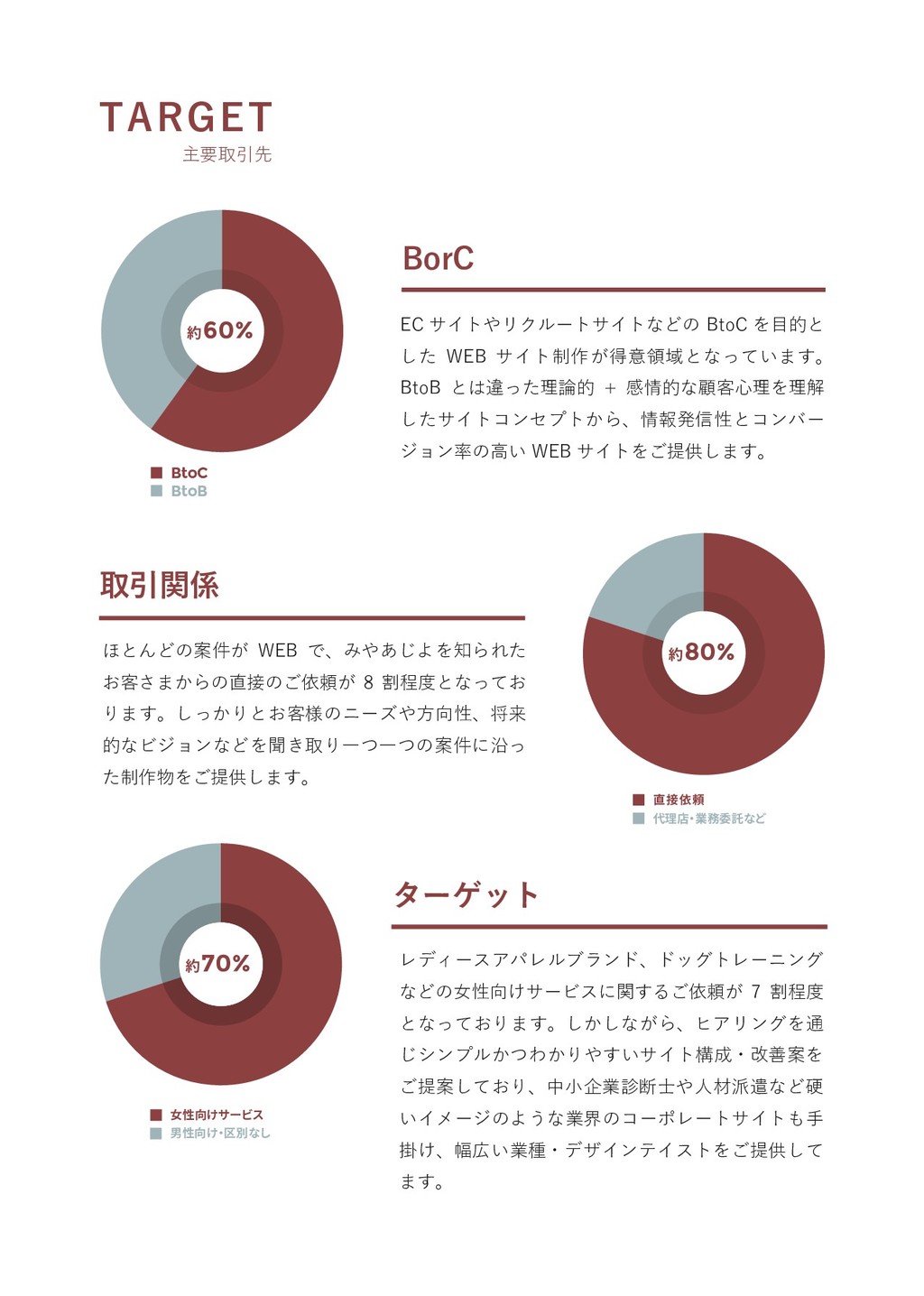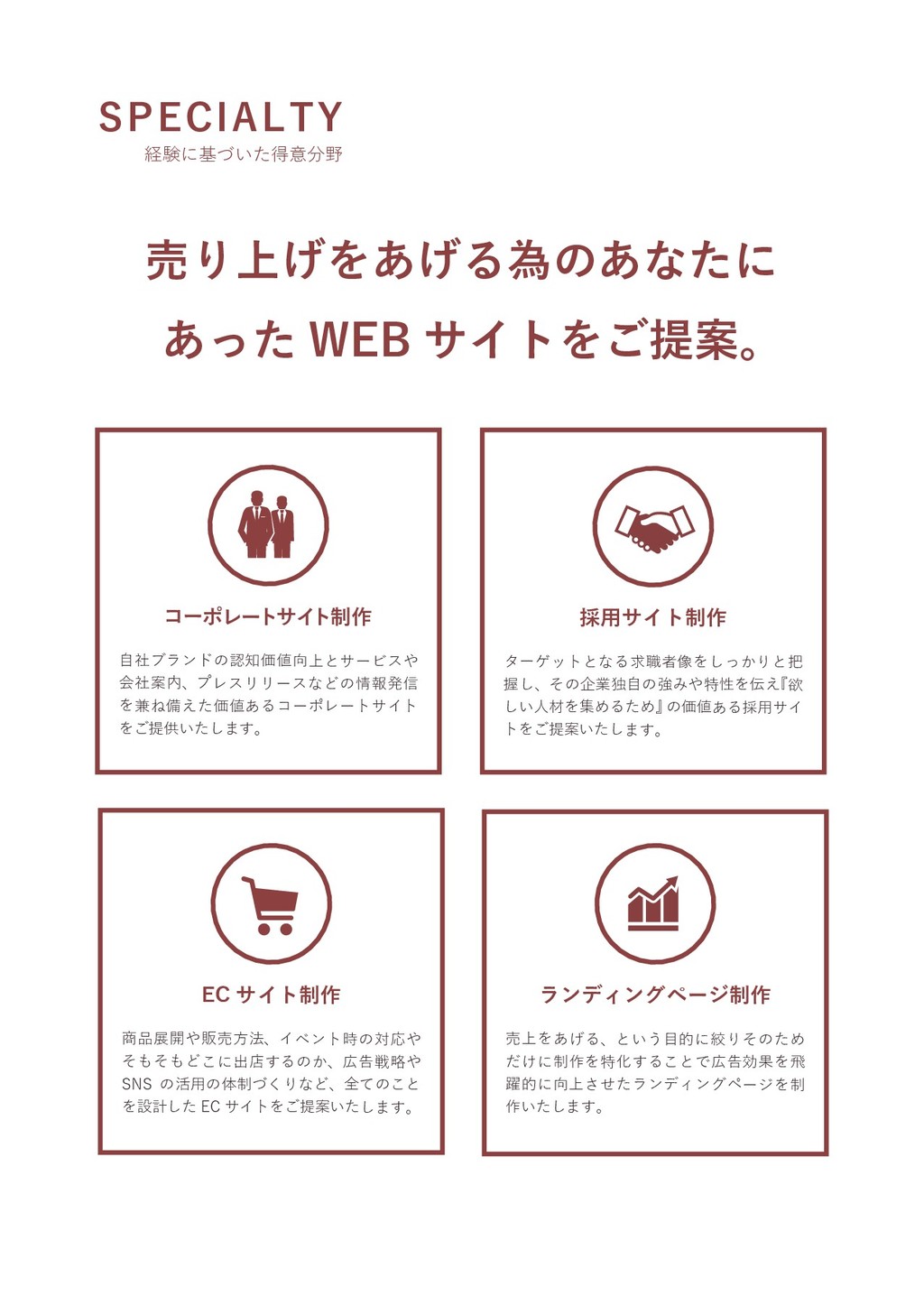 などの環境分析を行いますことで、大まかなコーポレー トサイト制作の方向性を決定します。 03 ターゲット調査 そのコーポレートサイトにとって『本当にターゲットと なる人物像』はなにか調査をし、最適なターゲット像を 選ぶことで制作のズレを抑えます。 04 ゴールの設定 これまでのヒアリング、競合・環境分析・ターゲット調 査から、客観的に制作するコーポレートサイトにとって 最もふさわしい目的を設定します。 05 サイト打ち合わせ 弊オフィスにて設定した『ターゲット』や『目的』をご 提案します。しっかりと打ち合わせすることで、お客様 とわたくしどもの熱量や方向性のズレを無くします。 06 デザインのご提案 コーポレートサイトのデザインをご提案します。お打ち 合わせでお客様としっかりとズレを無くしていますの で、的確なデザイン提案を致します。 07 構築・運用 決定したデザインを基に、コーポレートサイト構築のた めのHTMLコーディングを行います。正しいHTMLコー ディングはそれだけで、SEO 対策にります。 08 保守・解析 納品した後のコーポレートサイトに問題が発生しないよ う保守を致します。また、解析用コードを埋め込むこと により実践的な解析戦略を行うことが可能です 設 計 か ら 保 守 ま で 安 心 で き る ト ー タ ル サ ポ ー ト の W E B 制 作 会 社 で す ︒