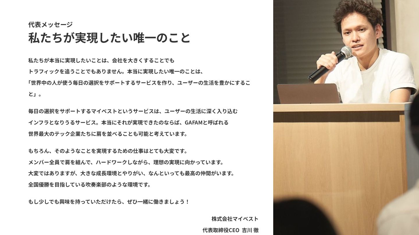 組織 ⼤学卒業後、新卒で⼤和証券SMBCへ⼊社し、公開 引受部⾨にて、上場を⽬指すベンチャー企業に対す る上場準備コンサルティングや上場時ファイナンス の引受業務に約6年間従事。業務を通じ「⾃分で事 業を⾏ってみたい」という気持ちが強くなり、株式 会社カカクコムに転職。約2年間、新規事業準備室 の新規事業責任者として、事業の企画⽴案から運営 までを取り仕切る。2016年に株式会社マイベスト を創業。2020年に LINEヤフーと資本業務提携し、 現在に⾄る。 2008年に⼤和証券SMBCに⼊社。投資銀⾏部⾨にて コーポレート‧ファイナンス、引受業務に携わった 後、グループ経営企画部にて戦略策定やIR業務を経 験。2019年12⽉よりマイベストに⼊社。取締役 CFOとして、コーポレート業務全般及びグループ連 携などを⾏う。 品川 智哉 CHRO 兼 ⼈事部⻑ 2014年にレバレジーズに⼊社。⼈材紹介エリア責 任者を経験し、事業推進室にて法⼈向けサービス⽴ ち上げ等を経験。その後⼈事部に異動し、後に⼈事 戦略部⻑に就任。採⽤‧組織開発/教育領域を管 掌。年間採⽤数400名‧従業員1,200名‧年商500億 の組 織までを経 験。2021年5⽉にマイベストに⼊ 社。現在はCHROとして⼈事領域全般を担当。 鈴⽊ 和真 取締役CTO 兼 開発部⻑ 2011年にカカクコムに⼊社。⾷べログや新規事業 にてバックエンドを中⼼にインフラからフロントエ ンドまで幅広く経験。その後、メルカリにて旅⾏事 業の⽴ち上げやネット決済の開発を⾏う。マイベス トにはサービス⽴ち上げ期から業務委託で参画し、 2020年に正社員として⼊社。リードエンジニアと してプロダクト開発を推進。2025年1⽉にCTOに就 任、同年10⽉より取締役‧開発部⻑を兼務。