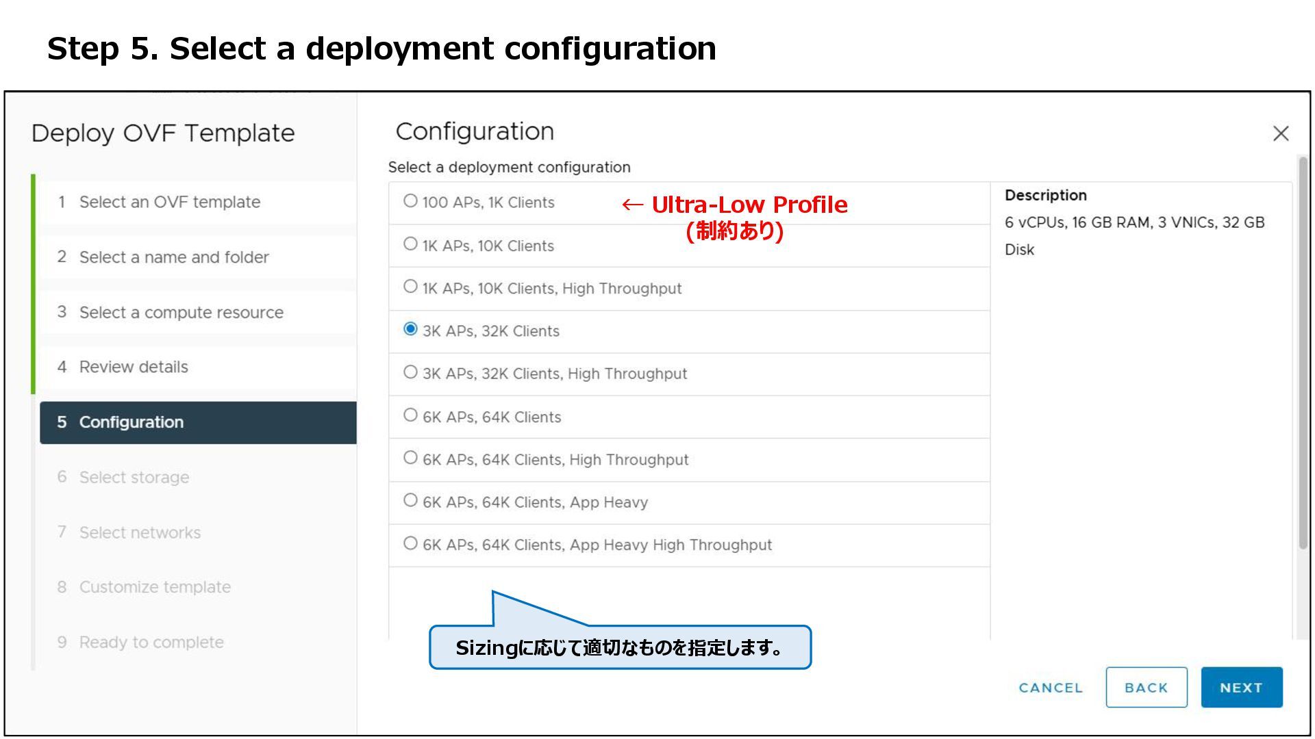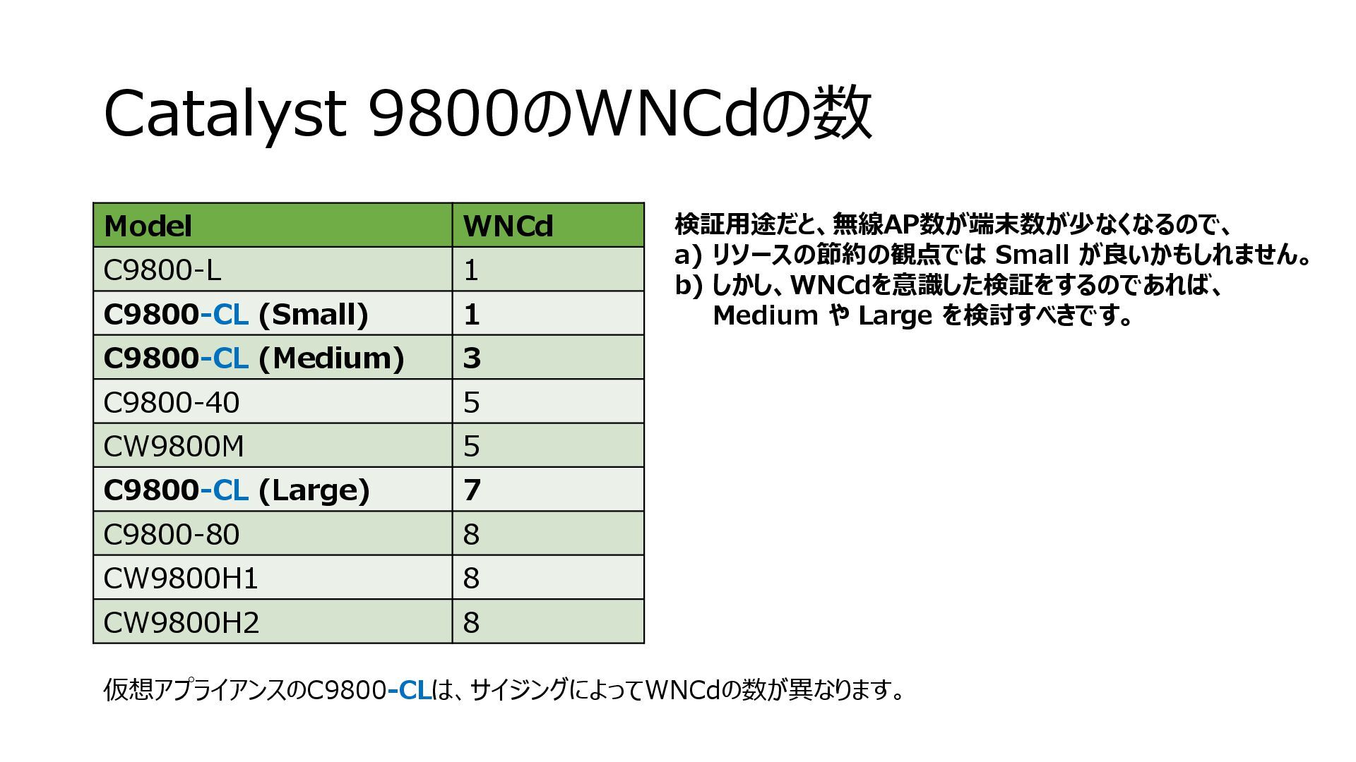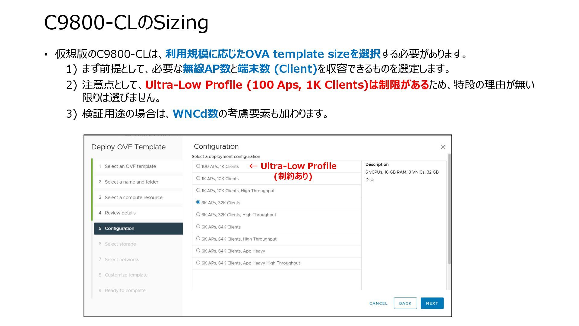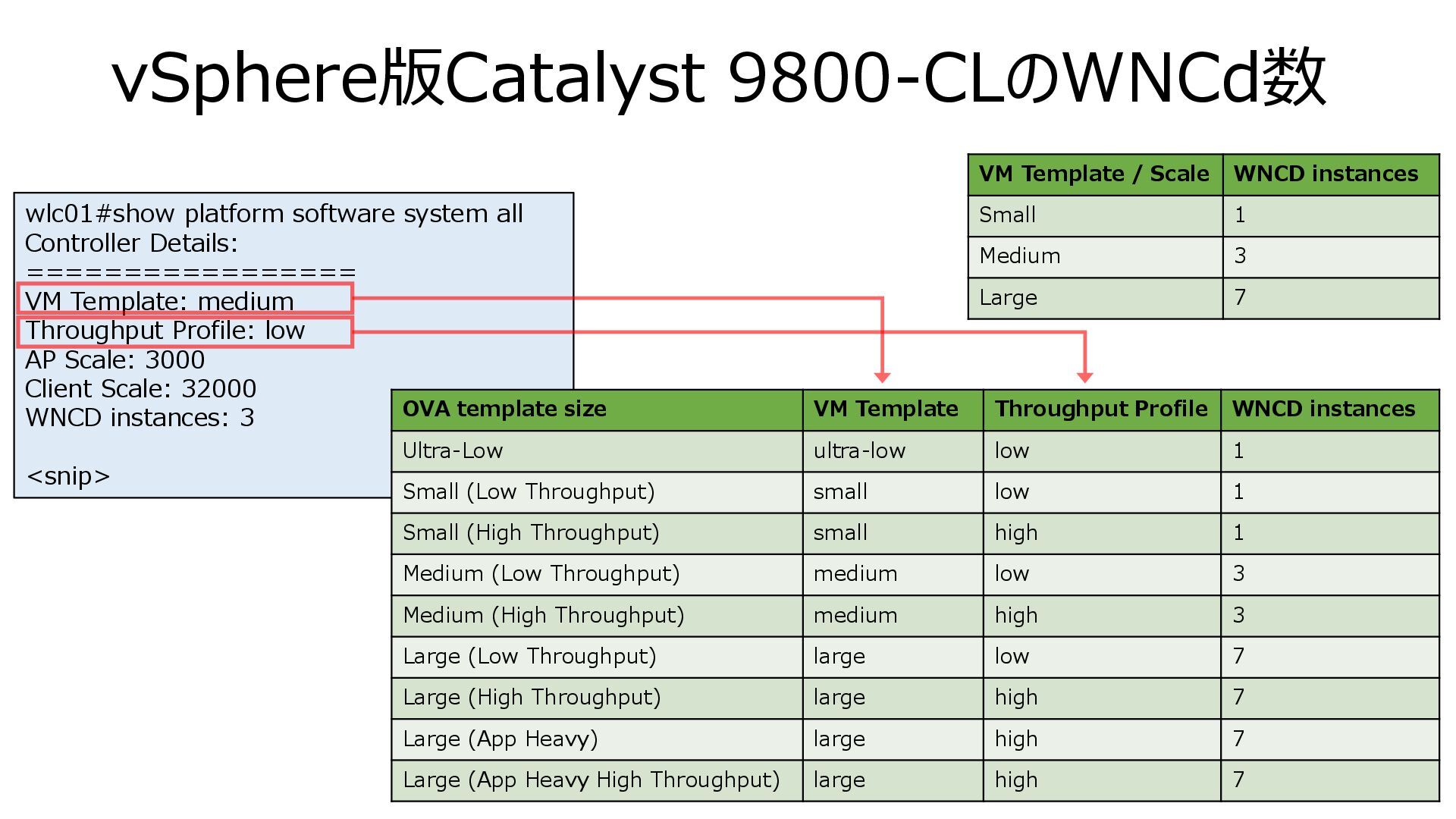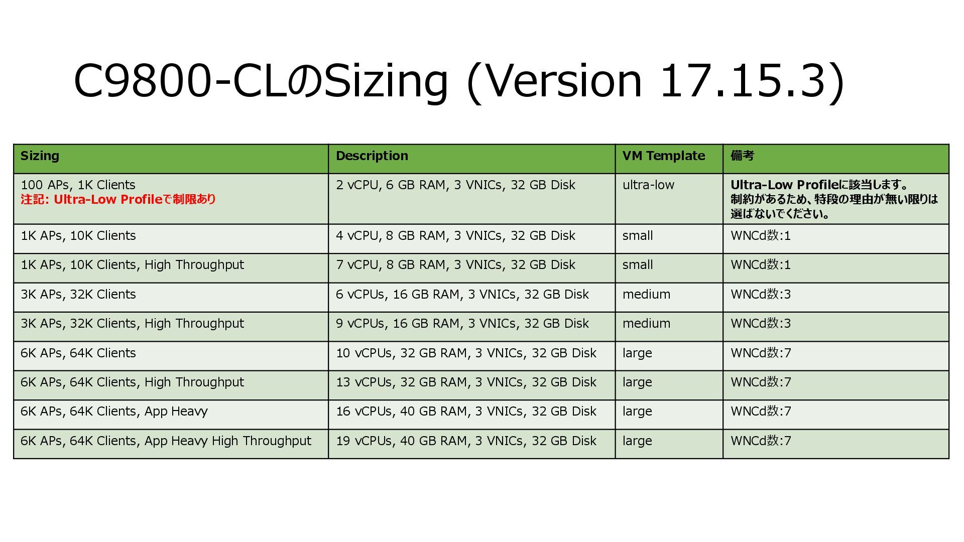 1K Clients 注記: Ultra-Low Profileで制限あり 2 vCPU, 6 GB RAM, 3 VNICs, 32 GB Disk ultra-low Ultra-Low Profileに該当します。 制約があるため、特段の理由が無い限りは 選ばないでください。 1K APs, 10K Clients 4 vCPU, 8 GB RAM, 3 VNICs, 32 GB Disk small WNCd数:1 1K APs, 10K Clients, High Throughput 7 vCPU, 8 GB RAM, 3 VNICs, 32 GB Disk small WNCd数:1 3K APs, 32K Clients 6 vCPUs, 16 GB RAM, 3 VNICs, 32 GB Disk medium WNCd数:3 3K APs, 32K Clients, High Throughput 9 vCPUs, 16 GB RAM, 3 VNICs, 32 GB Disk medium WNCd数:3 6K APs, 64K Clients 10 vCPUs, 32 GB RAM, 3 VNICs, 32 GB Disk large WNCd数:7 6K APs, 64K Clients, High Throughput 13 vCPUs, 32 GB RAM, 3 VNICs, 32 GB Disk large WNCd数:7 6K APs, 64K Clients, App Heavy 16 vCPUs, 40 GB RAM, 3 VNICs, 32 GB Disk large WNCd数:7 6K APs, 64K Clients, App Heavy High Throughput 19 vCPUs, 40 GB RAM, 3 VNICs, 32 GB Disk large WNCd数:7