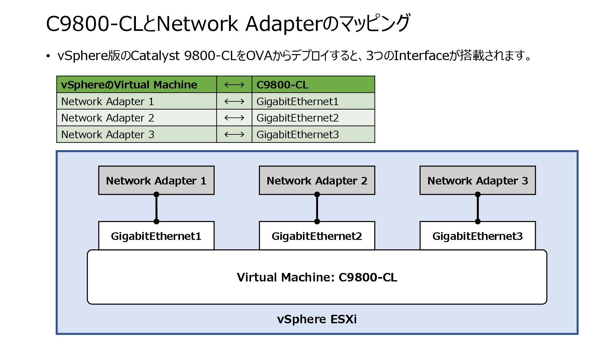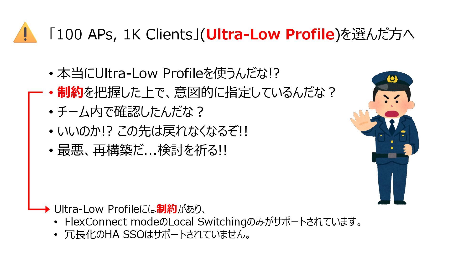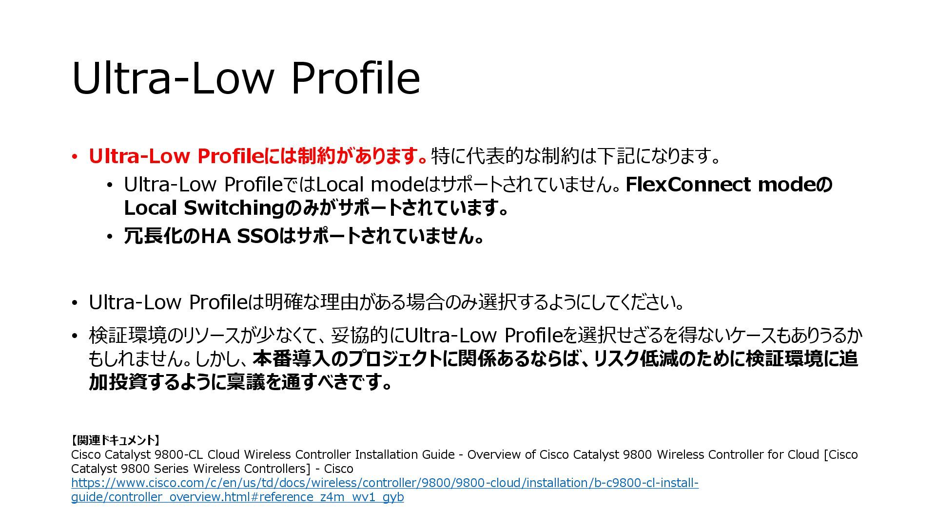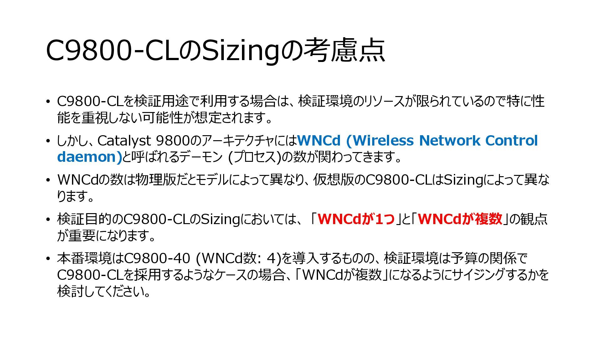 1K Clients 注記: Ultra-Low Profileで制限あり 2 vCPU, 6 GB RAM, 3 VNICs, 32 GB Disk ultra-low Ultra-Low Profileに該当します。 制約があるため、特段の理由が無い限りは 選ばないでください。 1K APs, 10K Clients 4 vCPU, 8 GB RAM, 3 VNICs, 32 GB Disk small WNCd数:1 1K APs, 10K Clients, High Throughput 7 vCPU, 8 GB RAM, 3 VNICs, 32 GB Disk small WNCd数:1 3K APs, 32K Clients 6 vCPUs, 16 GB RAM, 3 VNICs, 32 GB Disk medium WNCd数:3 3K APs, 32K Clients, High Throughput 9 vCPUs, 16 GB RAM, 3 VNICs, 32 GB Disk medium WNCd数:3 6K APs, 64K Clients 10 vCPUs, 32 GB RAM, 3 VNICs, 32 GB Disk large WNCd数:7 6K APs, 64K Clients, High Throughput 13 vCPUs, 32 GB RAM, 3 VNICs, 32 GB Disk large WNCd数:7 6K APs, 64K Clients, App Heavy 16 vCPUs, 40 GB RAM, 3 VNICs, 32 GB Disk large WNCd数:7 6K APs, 64K Clients, App Heavy High Throughput 19 vCPUs, 40 GB RAM, 3 VNICs, 32 GB Disk large WNCd数:7