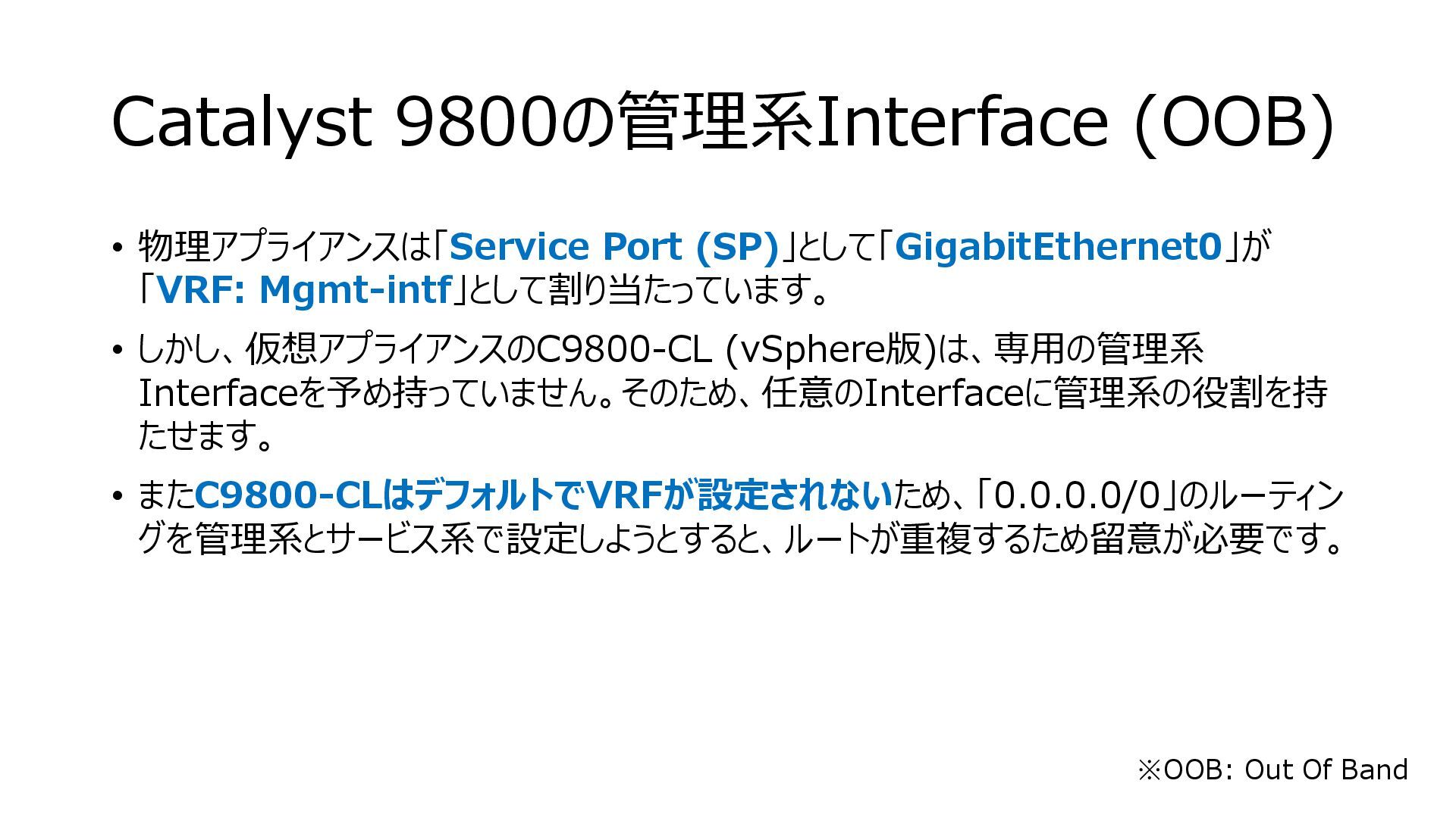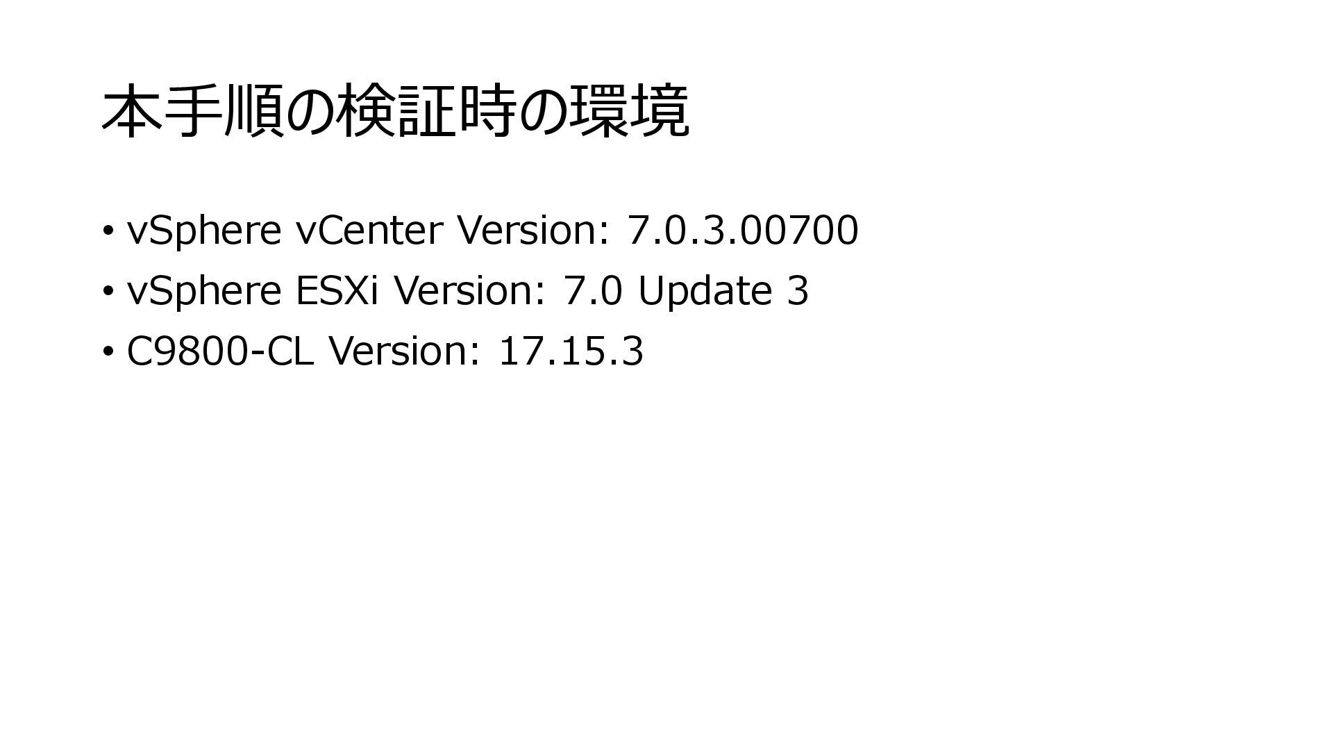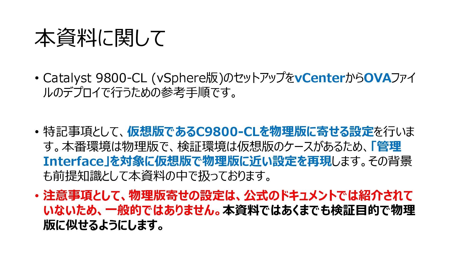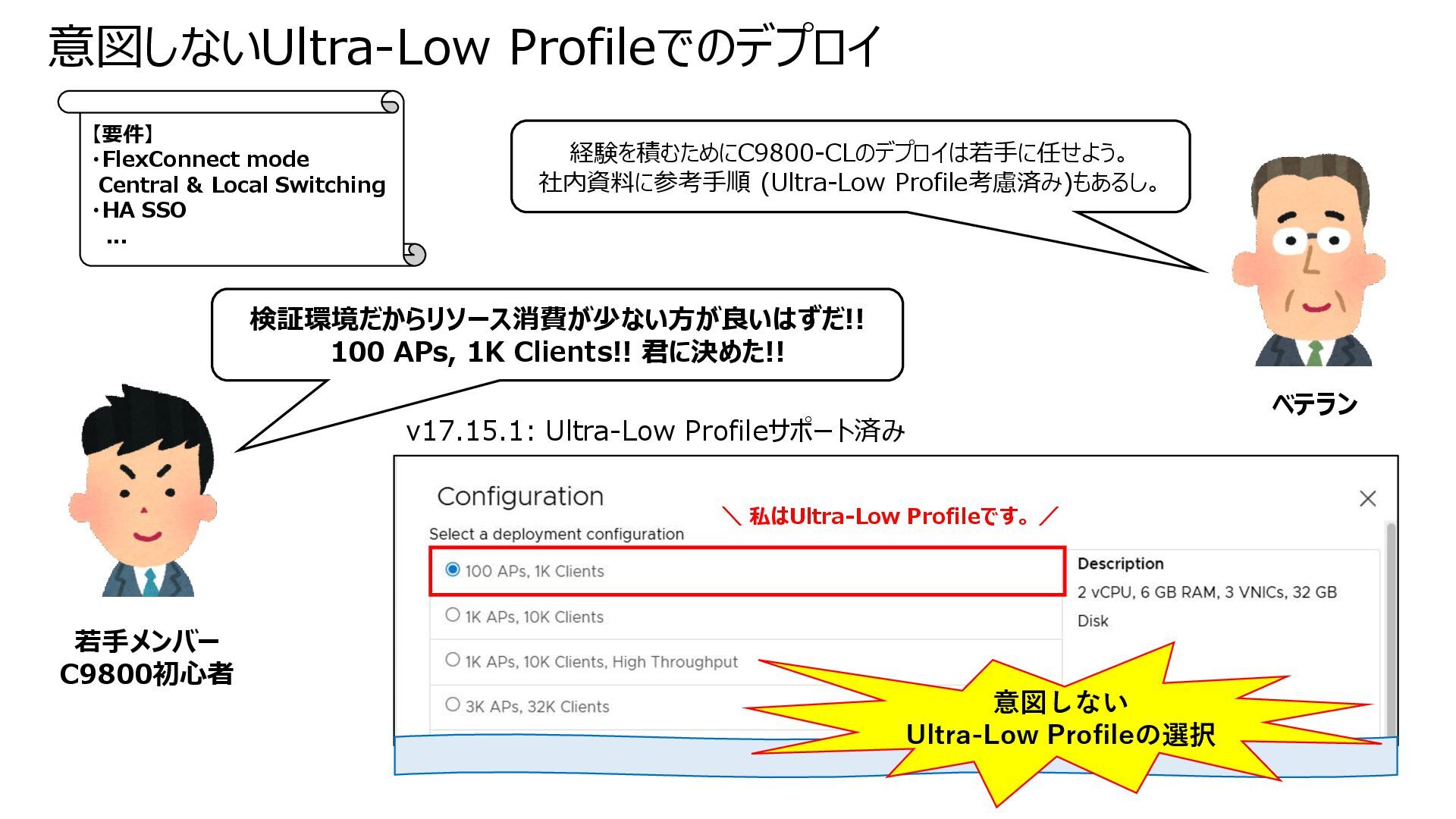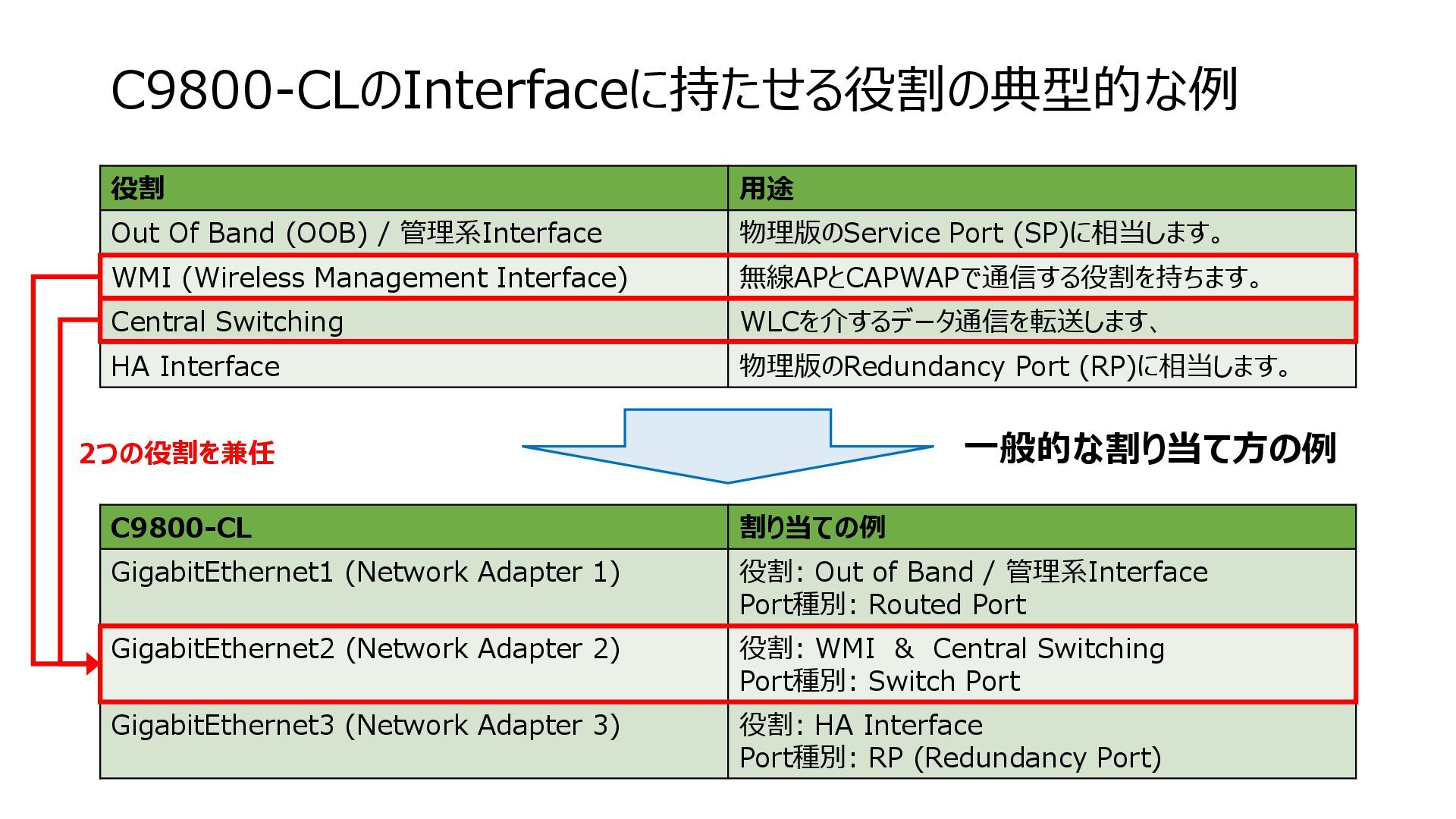 1K Clients 注記: Ultra-Low Profileで制限あり 2 vCPU, 6 GB RAM, 3 VNICs, 32 GB Disk ultra-low Ultra-Low Profileに該当します。 制約があるため、特段の理由が無い限りは 選ばないでください。 1K APs, 10K Clients 4 vCPU, 8 GB RAM, 3 VNICs, 32 GB Disk small WNCd数:1 1K APs, 10K Clients, High Throughput 7 vCPU, 8 GB RAM, 3 VNICs, 32 GB Disk small WNCd数:1 3K APs, 32K Clients 6 vCPUs, 16 GB RAM, 3 VNICs, 32 GB Disk medium WNCd数:3 3K APs, 32K Clients, High Throughput 9 vCPUs, 16 GB RAM, 3 VNICs, 32 GB Disk medium WNCd数:3 6K APs, 64K Clients 10 vCPUs, 32 GB RAM, 3 VNICs, 32 GB Disk large WNCd数:7 6K APs, 64K Clients, High Throughput 13 vCPUs, 32 GB RAM, 3 VNICs, 32 GB Disk large WNCd数:7 6K APs, 64K Clients, App Heavy 16 vCPUs, 40 GB RAM, 3 VNICs, 32 GB Disk large WNCd数:7 6K APs, 64K Clients, App Heavy High Throughput 19 vCPUs, 40 GB RAM, 3 VNICs, 32 GB Disk large WNCd数:7