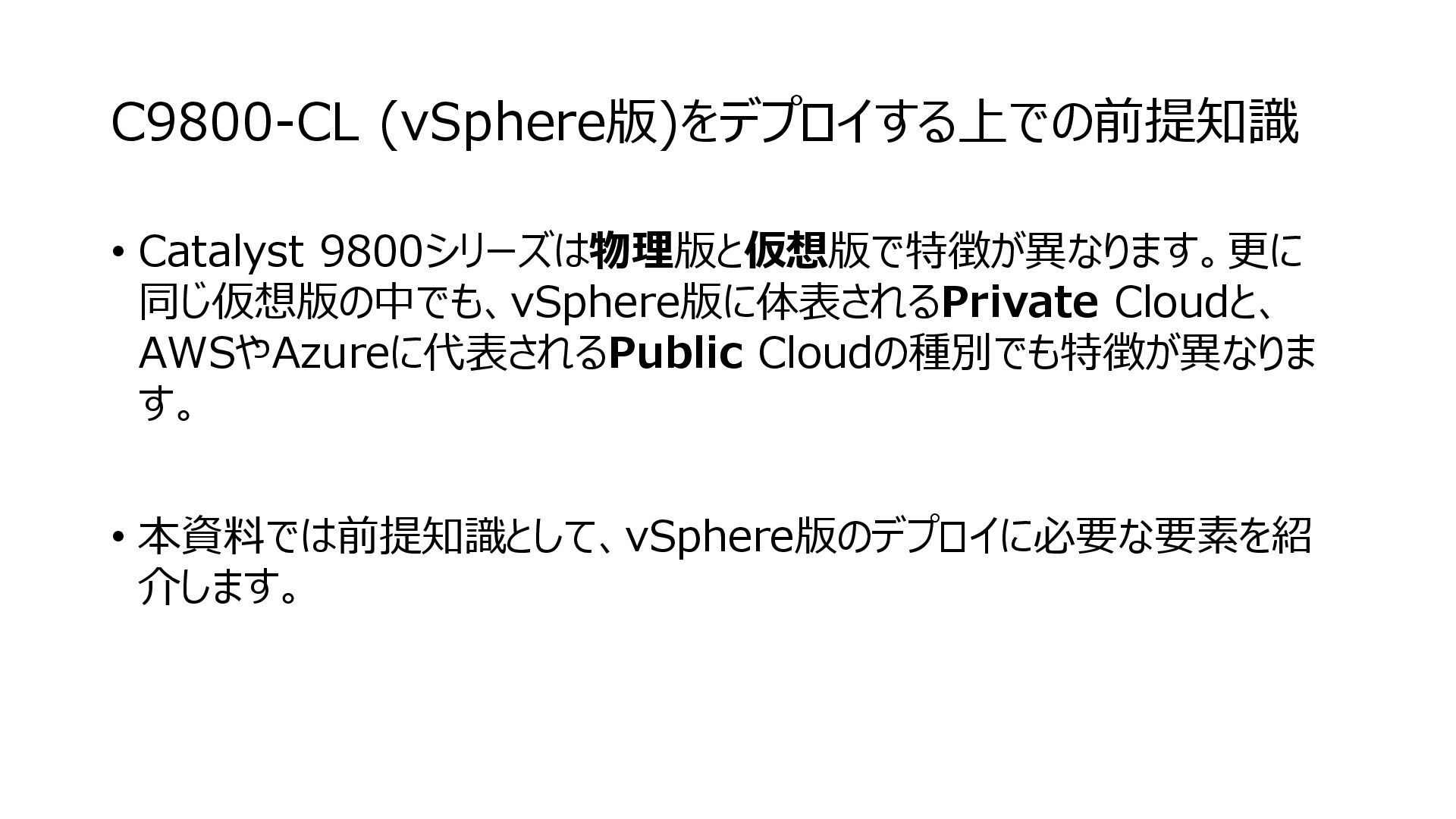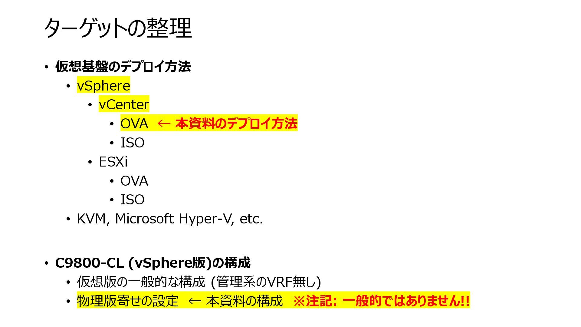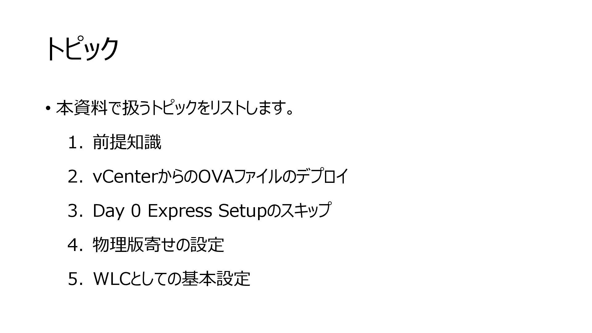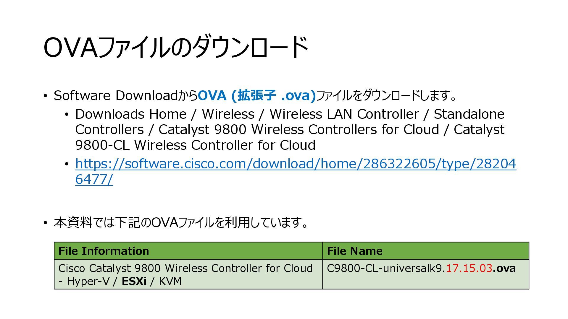 1K Clients 注記: Ultra-Low Profileで制限あり 2 vCPU, 6 GB RAM, 3 VNICs, 32 GB Disk ultra-low Ultra-Low Profileに該当します。 制約があるため、特段の理由が無い限りは 選ばないでください。 1K APs, 10K Clients 4 vCPU, 8 GB RAM, 3 VNICs, 32 GB Disk small WNCd数:1 1K APs, 10K Clients, High Throughput 7 vCPU, 8 GB RAM, 3 VNICs, 32 GB Disk small WNCd数:1 3K APs, 32K Clients 6 vCPUs, 16 GB RAM, 3 VNICs, 32 GB Disk medium WNCd数:3 3K APs, 32K Clients, High Throughput 9 vCPUs, 16 GB RAM, 3 VNICs, 32 GB Disk medium WNCd数:3 6K APs, 64K Clients 10 vCPUs, 32 GB RAM, 3 VNICs, 32 GB Disk large WNCd数:7 6K APs, 64K Clients, High Throughput 13 vCPUs, 32 GB RAM, 3 VNICs, 32 GB Disk large WNCd数:7 6K APs, 64K Clients, App Heavy 16 vCPUs, 40 GB RAM, 3 VNICs, 32 GB Disk large WNCd数:7 6K APs, 64K Clients, App Heavy High Throughput 19 vCPUs, 40 GB RAM, 3 VNICs, 32 GB Disk large WNCd数:7