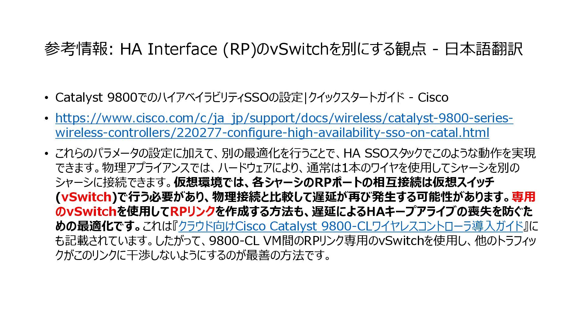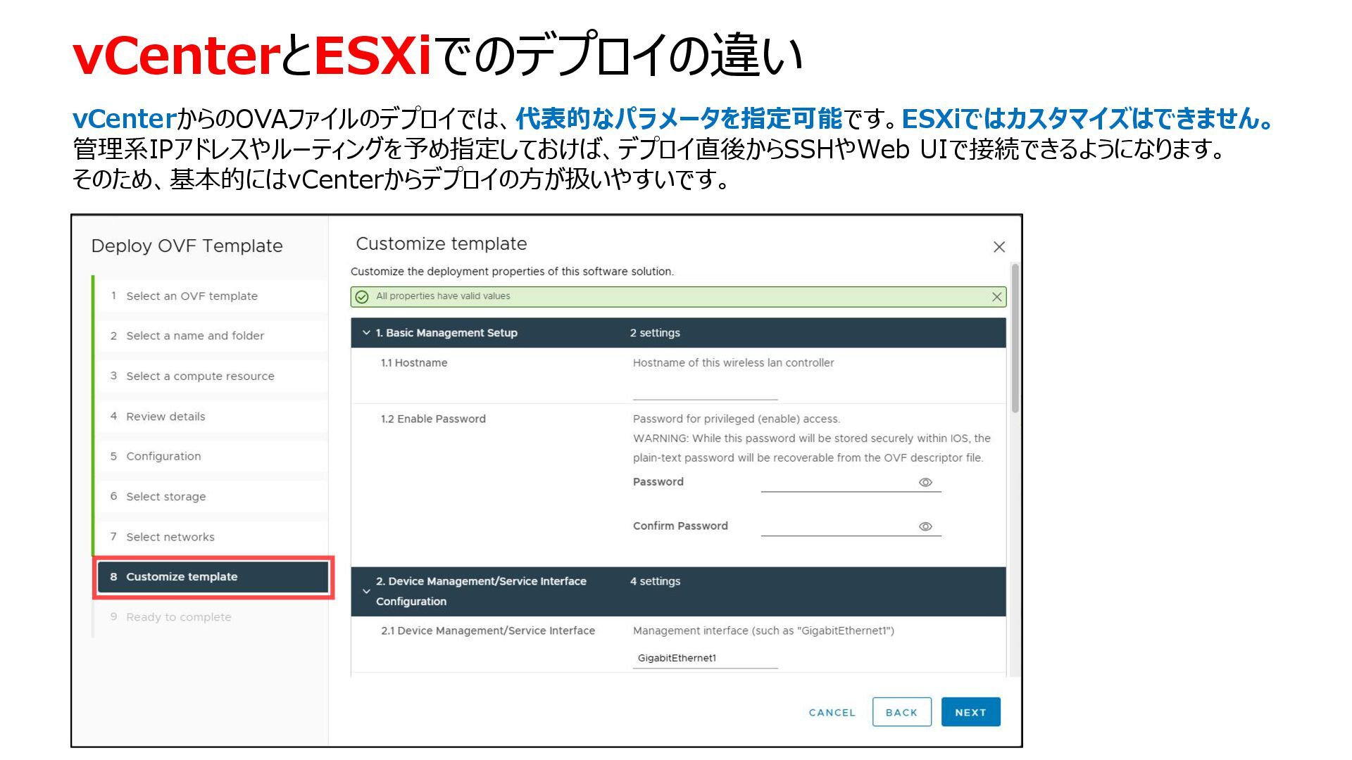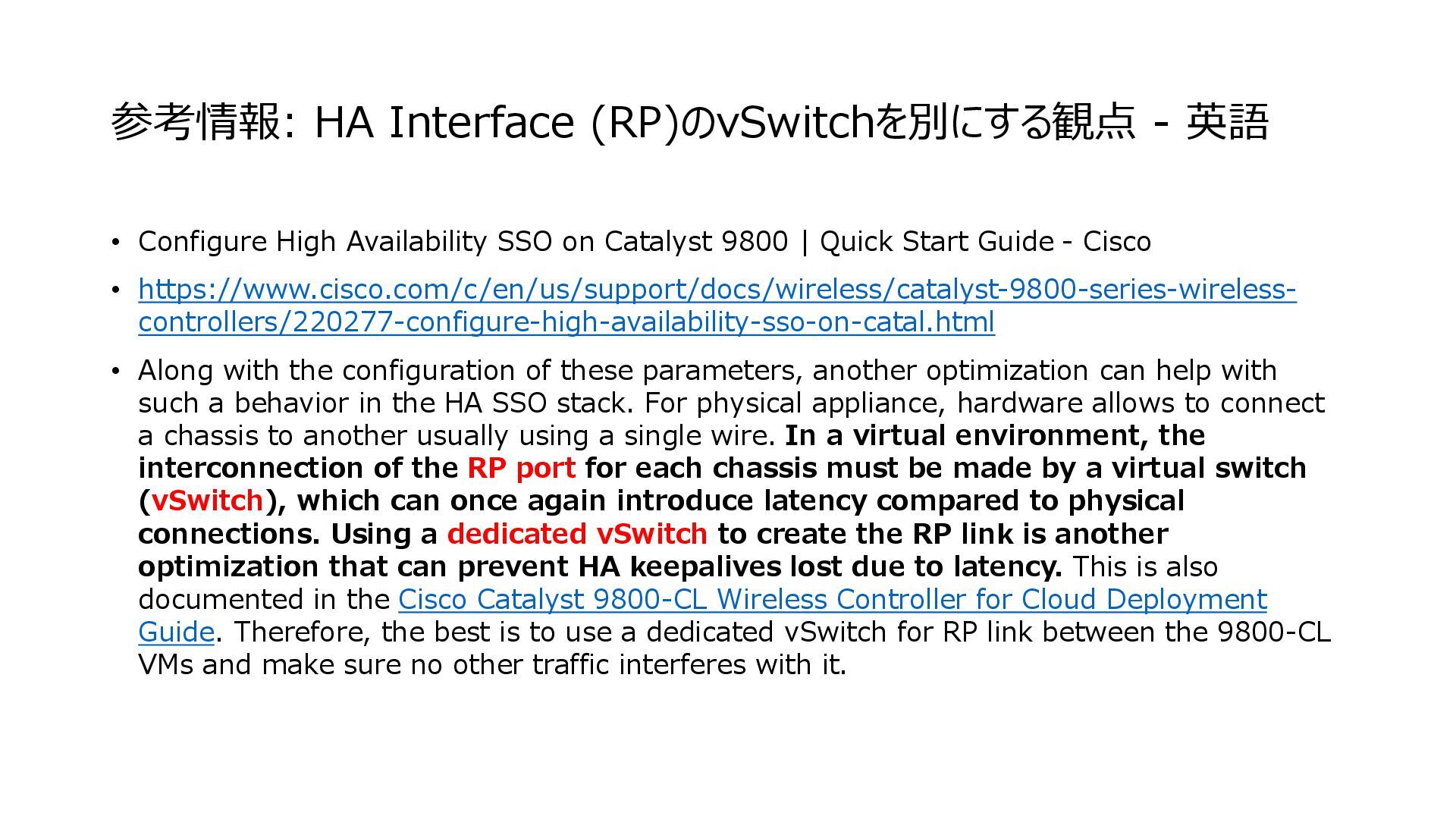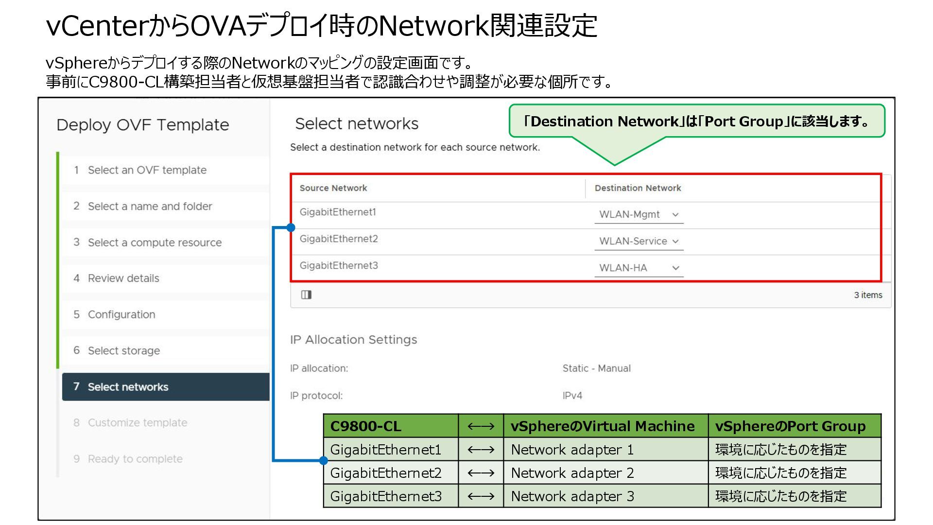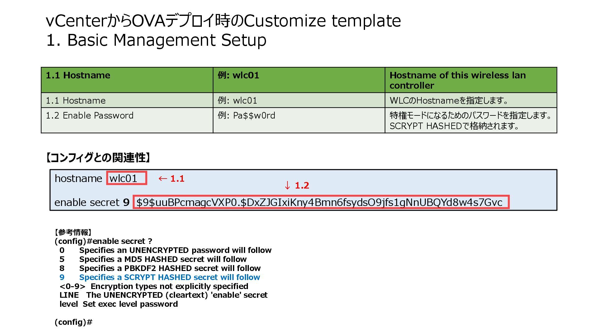 1K Clients 注記: Ultra-Low Profileで制限あり 2 vCPU, 6 GB RAM, 3 VNICs, 32 GB Disk ultra-low Ultra-Low Profileに該当します。 制約があるため、特段の理由が無い限りは 選ばないでください。 1K APs, 10K Clients 4 vCPU, 8 GB RAM, 3 VNICs, 32 GB Disk small WNCd数:1 1K APs, 10K Clients, High Throughput 7 vCPU, 8 GB RAM, 3 VNICs, 32 GB Disk small WNCd数:1 3K APs, 32K Clients 6 vCPUs, 16 GB RAM, 3 VNICs, 32 GB Disk medium WNCd数:3 3K APs, 32K Clients, High Throughput 9 vCPUs, 16 GB RAM, 3 VNICs, 32 GB Disk medium WNCd数:3 6K APs, 64K Clients 10 vCPUs, 32 GB RAM, 3 VNICs, 32 GB Disk large WNCd数:7 6K APs, 64K Clients, High Throughput 13 vCPUs, 32 GB RAM, 3 VNICs, 32 GB Disk large WNCd数:7 6K APs, 64K Clients, App Heavy 16 vCPUs, 40 GB RAM, 3 VNICs, 32 GB Disk large WNCd数:7 6K APs, 64K Clients, App Heavy High Throughput 19 vCPUs, 40 GB RAM, 3 VNICs, 32 GB Disk large WNCd数:7