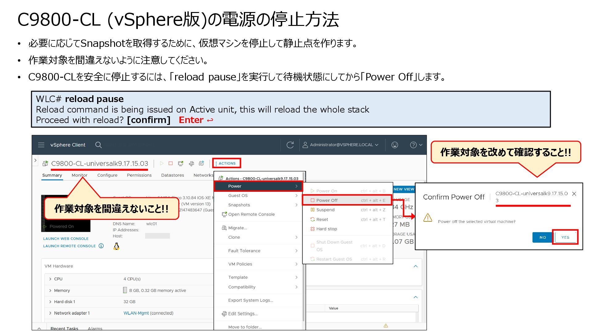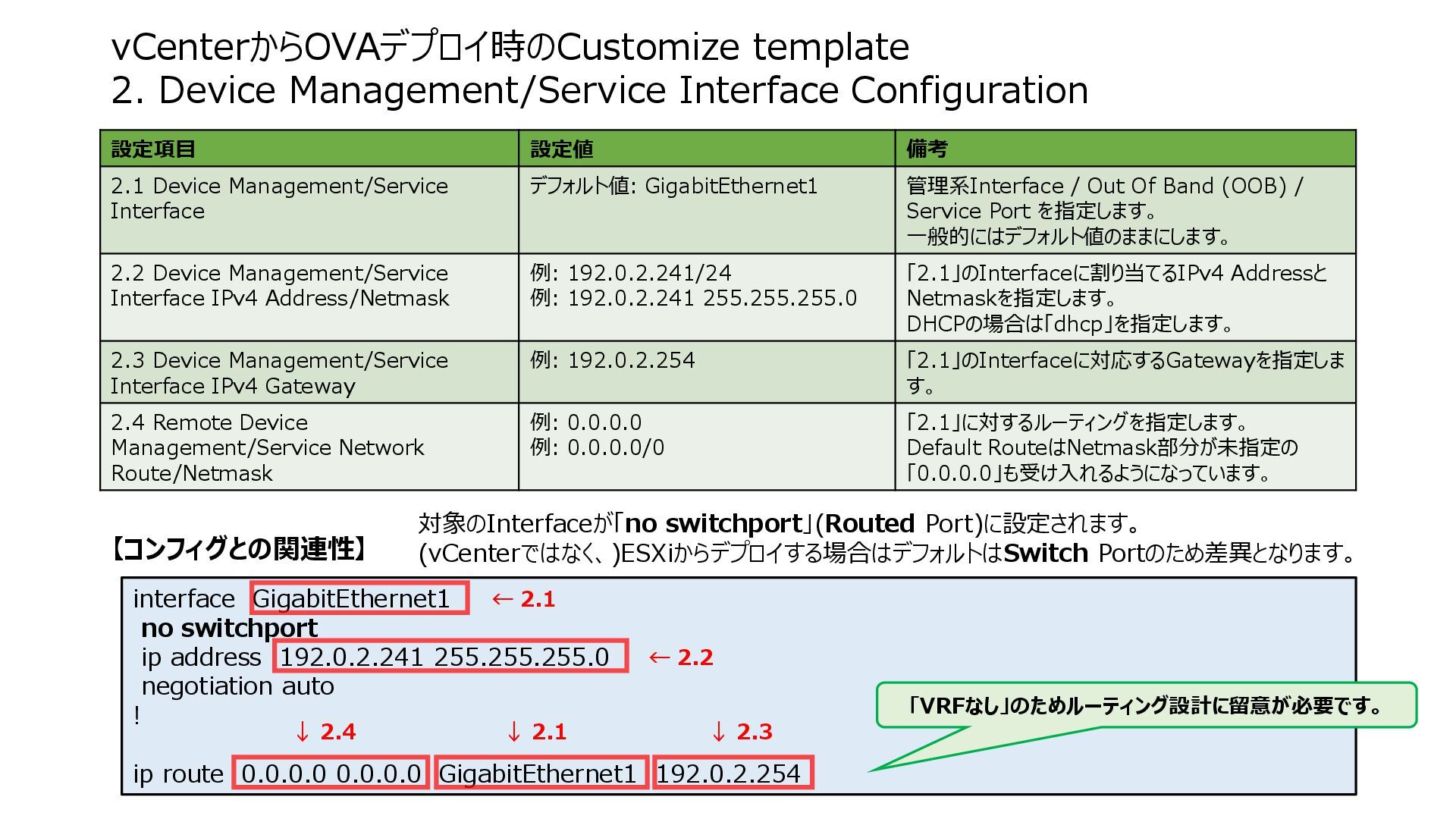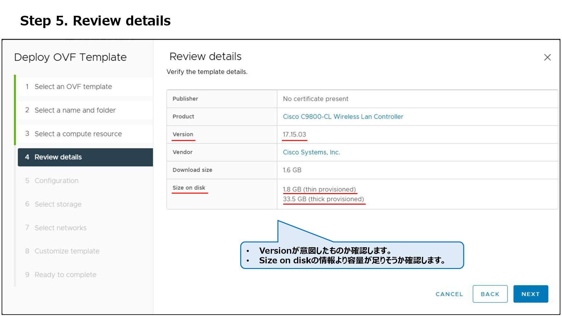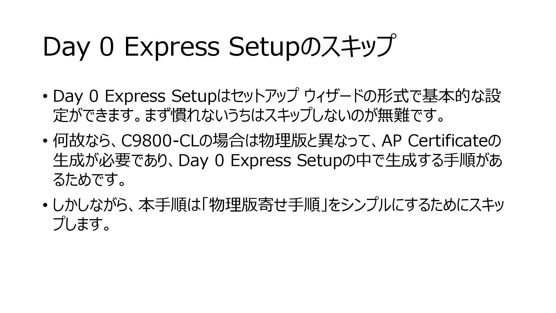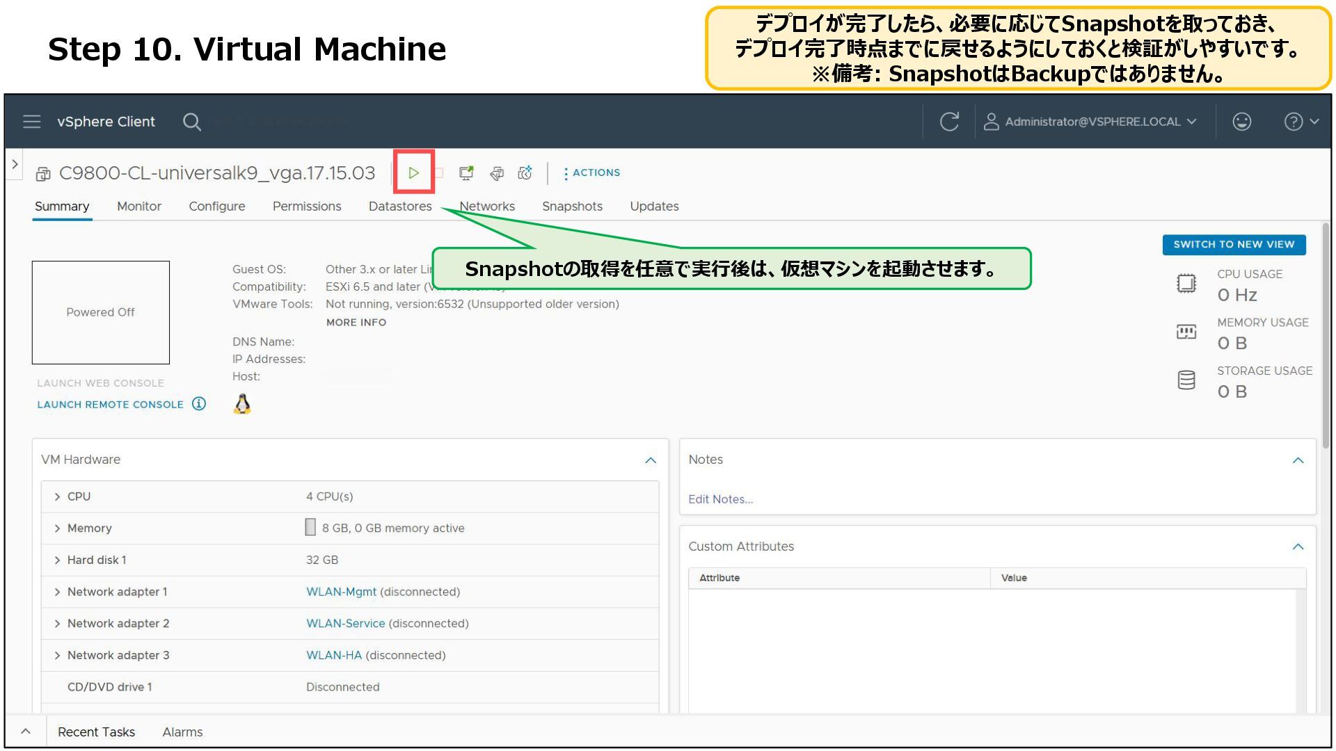 1K Clients 注記: Ultra-Low Profileで制限あり 2 vCPU, 6 GB RAM, 3 VNICs, 32 GB Disk ultra-low Ultra-Low Profileに該当します。 制約があるため、特段の理由が無い限りは 選ばないでください。 1K APs, 10K Clients 4 vCPU, 8 GB RAM, 3 VNICs, 32 GB Disk small WNCd数:1 1K APs, 10K Clients, High Throughput 7 vCPU, 8 GB RAM, 3 VNICs, 32 GB Disk small WNCd数:1 3K APs, 32K Clients 6 vCPUs, 16 GB RAM, 3 VNICs, 32 GB Disk medium WNCd数:3 3K APs, 32K Clients, High Throughput 9 vCPUs, 16 GB RAM, 3 VNICs, 32 GB Disk medium WNCd数:3 6K APs, 64K Clients 10 vCPUs, 32 GB RAM, 3 VNICs, 32 GB Disk large WNCd数:7 6K APs, 64K Clients, High Throughput 13 vCPUs, 32 GB RAM, 3 VNICs, 32 GB Disk large WNCd数:7 6K APs, 64K Clients, App Heavy 16 vCPUs, 40 GB RAM, 3 VNICs, 32 GB Disk large WNCd数:7 6K APs, 64K Clients, App Heavy High Throughput 19 vCPUs, 40 GB RAM, 3 VNICs, 32 GB Disk large WNCd数:7